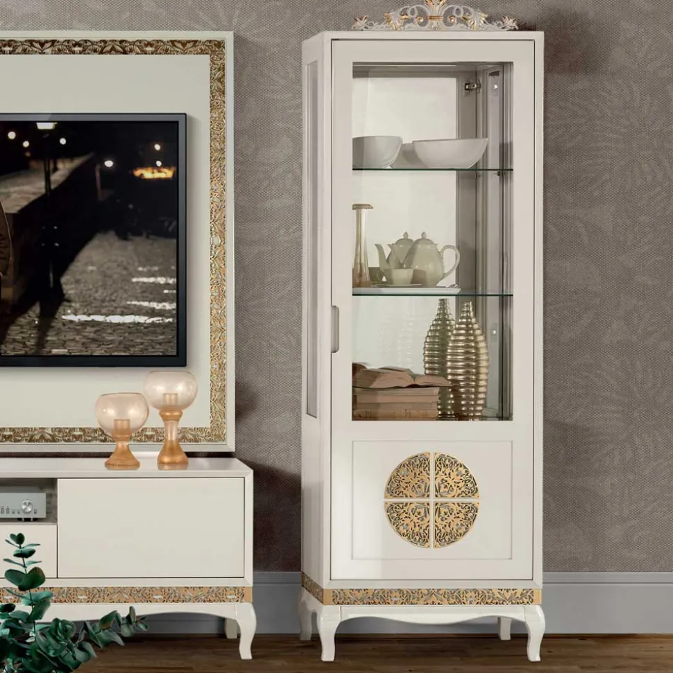 Eingehüllt in eine weiße, matte Lackierung erstrahlt die Wohnwand „Valganios“ in schlichter Eleganz. Teilweise zieren florale Muster die Oberfläche, die mit einer plastischen Struktur hervorgehoben und mit echtem Blattgold veredelt sind – ein Statement von Luxus und Raffinesse.