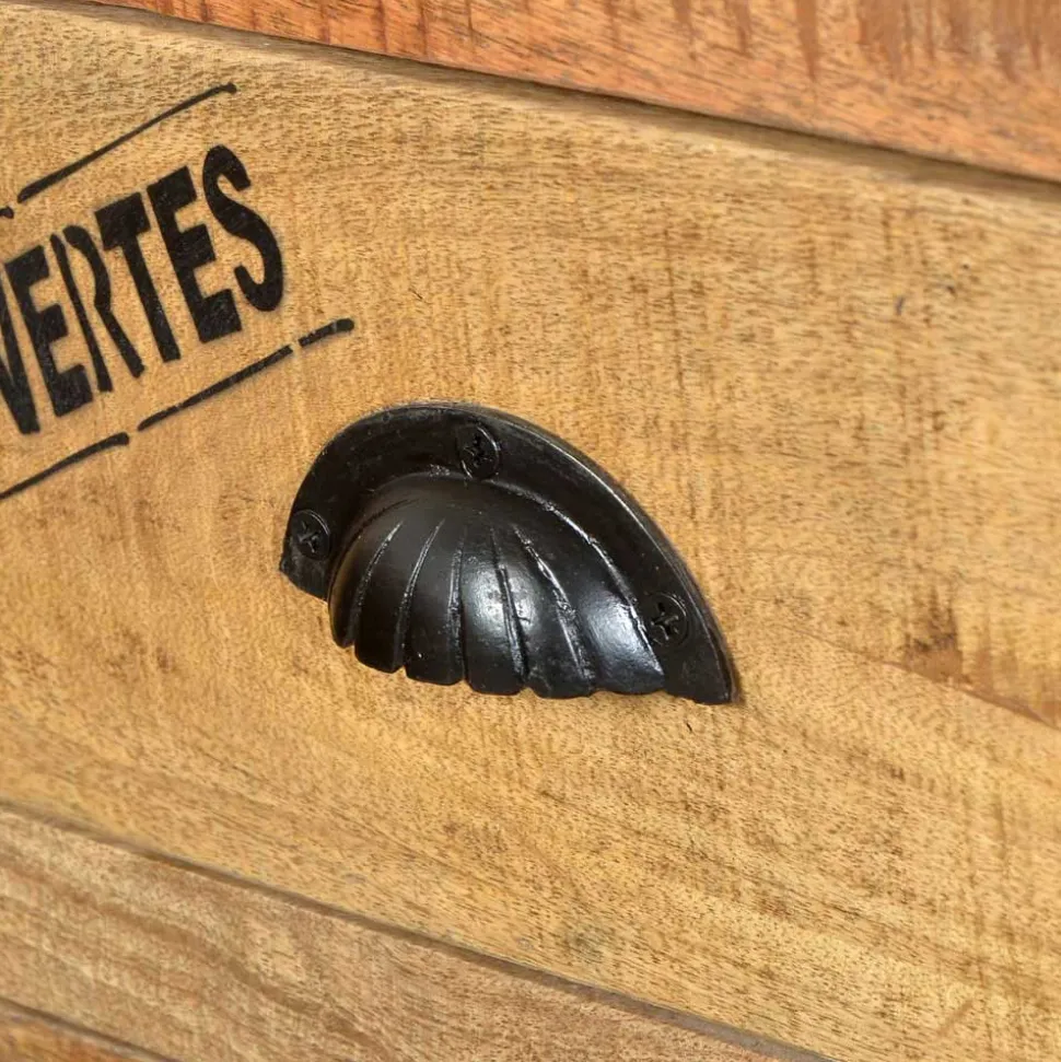 Die offenen Seiten der Schubladen, verziert mit urigen Metallstangen, und die Muschelgriffe sowie Rollen in Vintage-Schwarz setzen eindrucksvolle Kontraste zum warmen Mangoholz.
