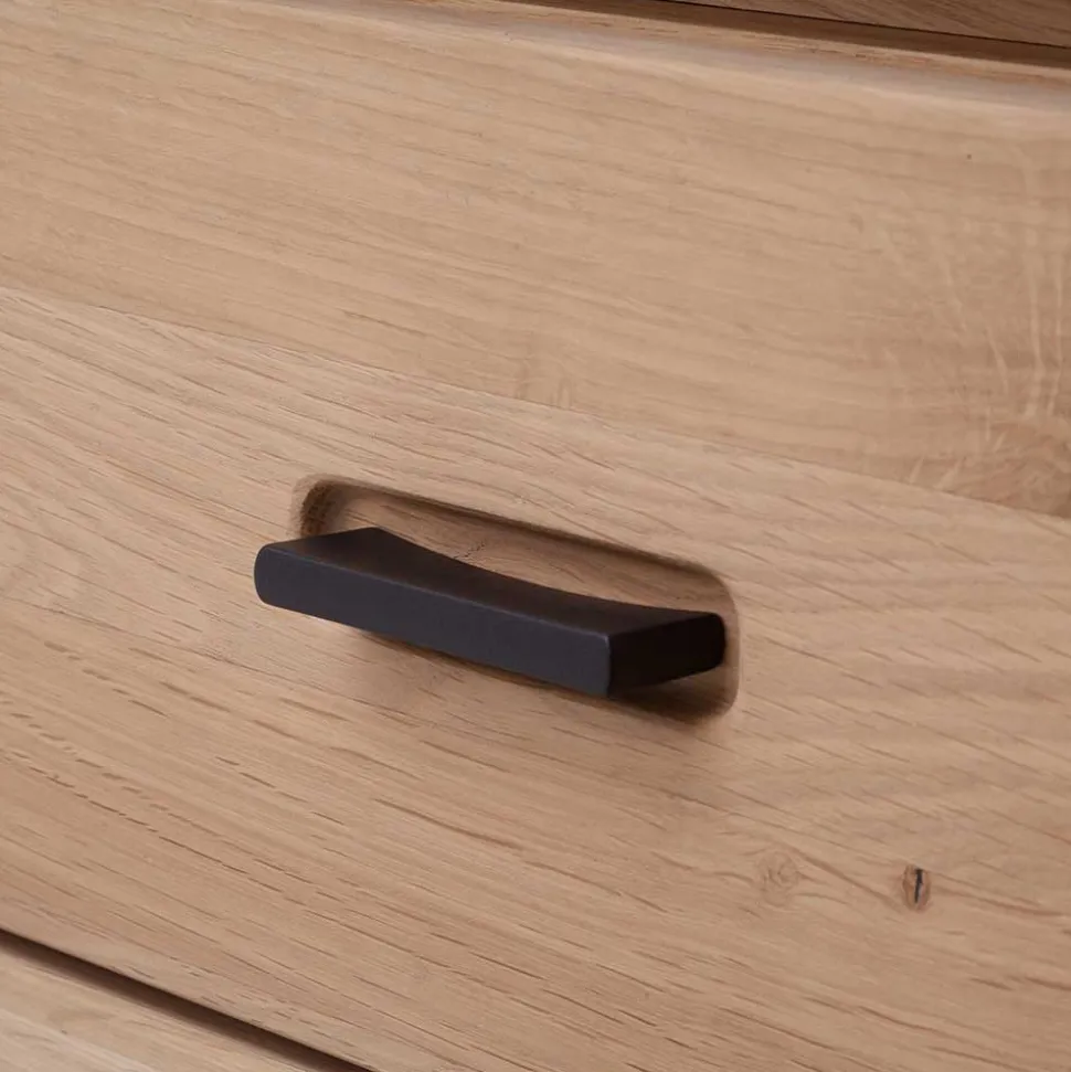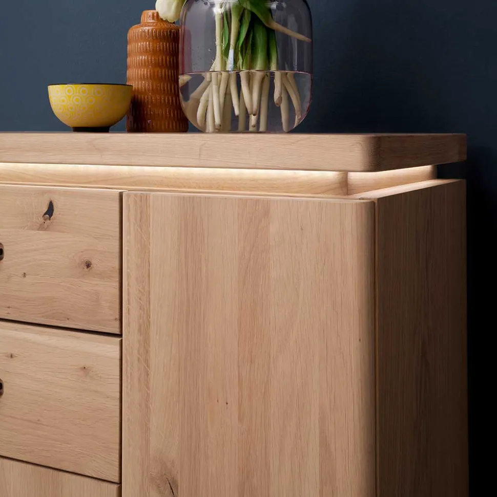 Die Fronten aus massiver Balkeneiche verleihen jedem Element einen einzigartigen Charakter. Die Balkeneiche ist bekannt für ihre Robustheit und Langlebigkeit. Durch die Ölung der Oberflächen wird nicht nur die markante Maserung betont, sondern auch ein Schutz gegen alltägliche Abnutzung geboten. Die Korpusse aus hochwertiger Spanplatte sind echtholzfurniert und ebenso geölt, wodurch eine harmonische Optik erzielt wird. Die Rückwände in Eiche Holzoptik foliert, runden das Gesamtbild perfekt ab.