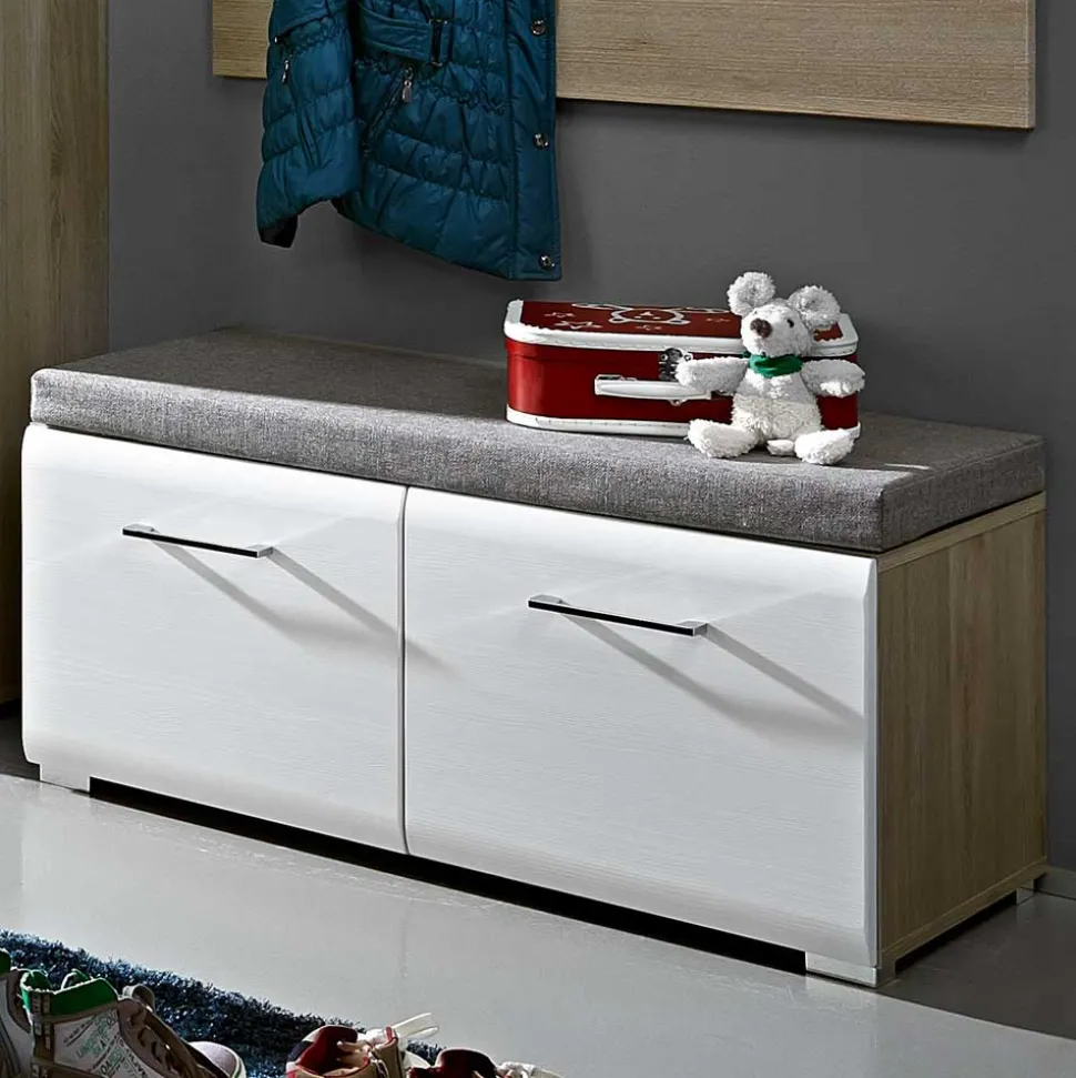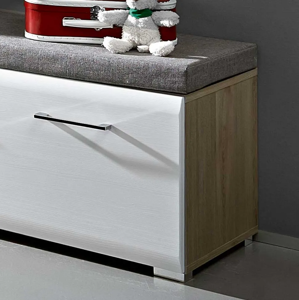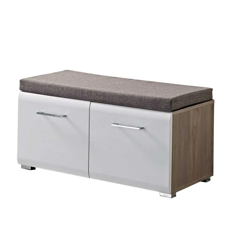 Modernes Design zeichnet sich durch klare Linien, schlichte Formen und funktionale Eleganz aus. Die Dielenbank „Brosgo“ vereint all diese Merkmale und besticht durch ihr harmonisches Zusammenspiel aus Weiß und Silbereiche. Die folierte Oberfläche in Weiß verleiht der Bank eine zeitlose Schönheit, während die Absetzungen in Silbereiche mit toller Struktur für einen angenehmen Kontrast sorgen. Dieses Design passt sich mühelos verschiedenen Einrichtungsstilen an und bringt gleichzeitig eine frische, moderne Note in Ihr Zuhause.