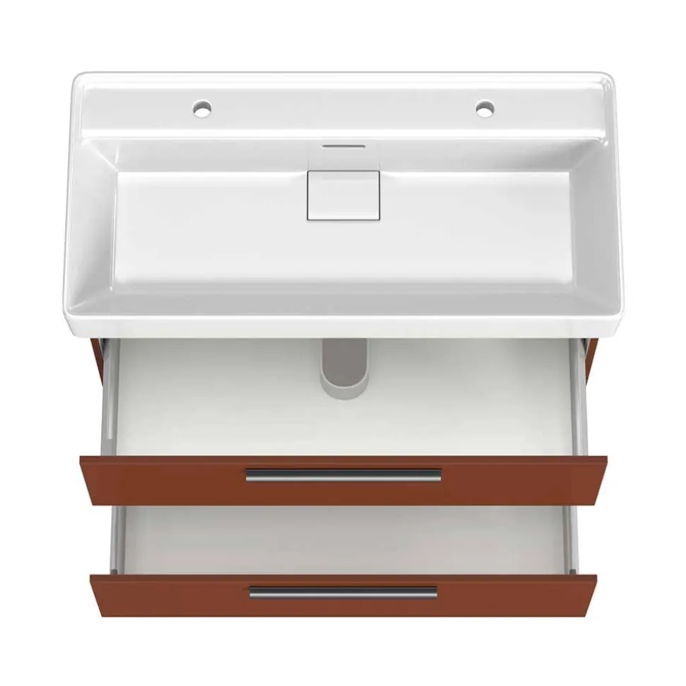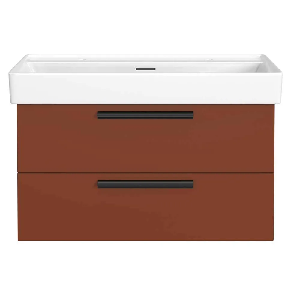 Gefertigt aus strapazierfähigem MDF, ist der Waschtisch optimal für den Einsatz in feuchten Räumen konzipiert. Die Außenflächen sind in edlem Dunkelrot foliert, während die Innenbereiche mit einer hellen weißen Beschichtung versehen sind. Die tiefgezogenen Kanten sorgen für eine makellose Optik und schützen das Material zusätzlich vor Feuchtigkeit. Schwarze Metallgriffleisten setzen einen modernen Kontrast und unterstreichen das elegante Design.