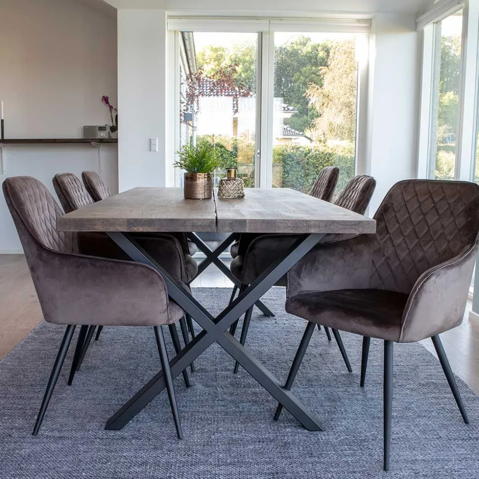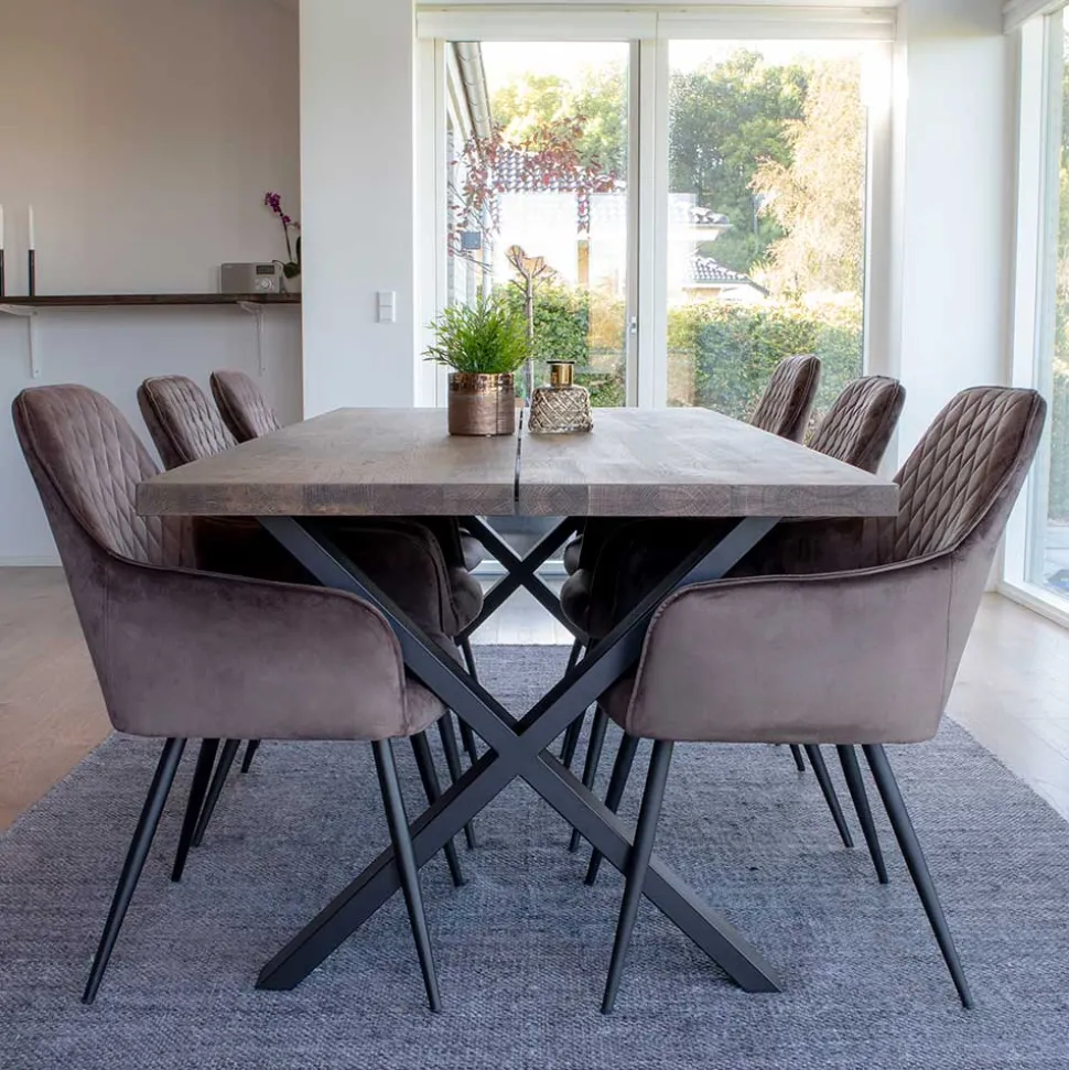Der zum Möbel-Set Dicampo gehörende Tisch in modern-elegantem Design ist 200x75x95 cm groß und aus massiver Eiche gefertigt. Alle Holz-Oberflächen sind zum Schutz und für eine dunkle Optik mit Räucheröl behandelt. Die markante Tischplatte ist zweiteilig ausgeführt, wobei es in der Mitte längs einen kleinen Spalt gibt, welcher den besonderen Charakter des Eiche Tisches noch einmal unterstreicht. Zwei schwarze X-Füße aus Stahl-Vierkantrohr (jeweils ca. 4×10 cm) mit Abmessungen von jeweils ca. 886x72x10 cm (BxHxT) tragen die Tischplatte sicher und stabil.
