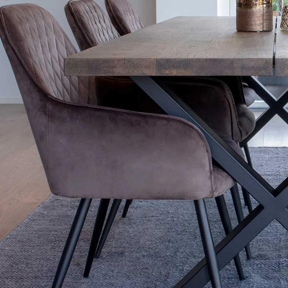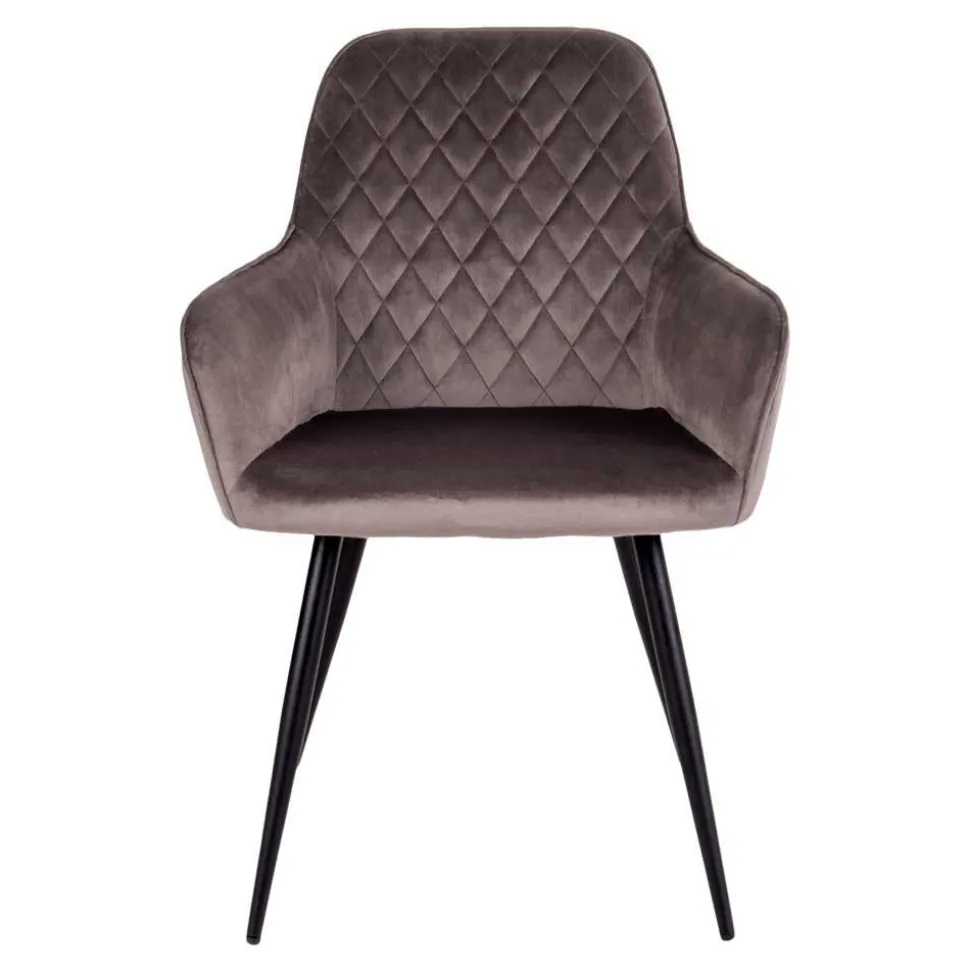 Zum siebenteiligen Möbel-Set Dicampo gehören außerdem sechs Armlehnstühle, welche mit schimmernden Bezügen aus Samt (100 % Polyester) im attraktiven Farbton Taupe bezogen sind. Die Rückenlehnen sind dekorativ mit einer Rauten-Steppung verziert. Jeder Stuhl hat vier schwarze Metallbeine, die sich nach unten hin verjüngen und für Stabilität (max. Belastbarkeit je Stuhl: 130 kg) und einen sicheren Stand sorgen. Freuen Sie sich auf eine angenehme Sitzhöhe von ca. 47 cm und eine ebenso ausfallende Sitztiefe. Die Komplett-Abmessungen eines Armlehnstuhls liegen bei 57x87x56 cm (BxHxT).