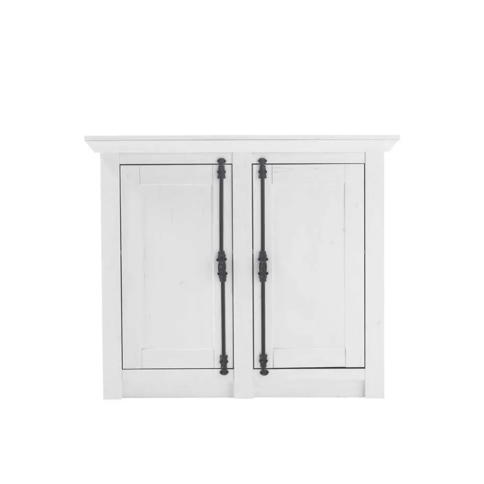 Die Schubladen sind mit soliden Metallauszügen ausgestattet, die reibungslose Bewegung und Stabilität gewährleisten. Die klassischen Knopfgriffe und rustikalen Stangengriffe aus Metall in Schwarz setzen einen optischen Kontrast und verleihen dem Set eine besondere Note.