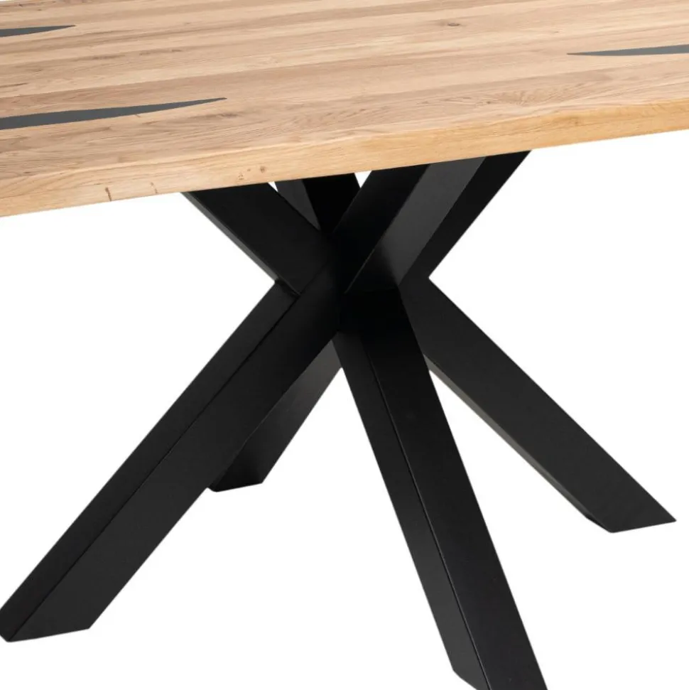 Die Tischplatte des Eiche Esszimmertischs „Slavidra“ ist 2 cm stark und auf 4 cm aufgedoppelt, was ihr Stabilität und eine hochwertige, wertige Optik verleiht. Die durchgehende Lamellenverarbeitung, die rustikal lackierte Oberfläche und die mit Kitt gespachtelten Stellen unterstreichen den natürlichen Charakter des Holzes und machen die Platte zu einem Unikat. Die langen Seiten sind mit natürlichen, unterschiedlich gewellten Baumkanten versehen, die den Tisch lebendig und unverwechselbar wirken lassen. Besonders eindrucksvoll sind die vier Epoxid-Harz-Flammen-Einlagen, jeweils zwei an jedem kurzen Ende, die kunstvoll in die Holzplatte eingearbeitet sind. Sie erzeugen raffinierte Lichteffekte und setzen den Tisch gekonnt in Szene.