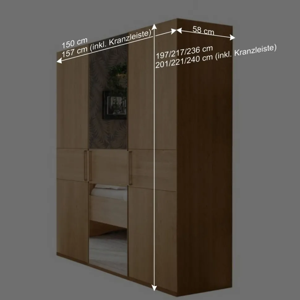 Mit einer Tiefe von 58 cm und einer Breite von 150 cm bietet der „Emdsiva I“ ausreichend Platz für Ihre Kleidung und Wäsche. Je nach Ihrer Wahl können Sie zwischen einer Höhe von 197 cm, 217 cm oder 236 cm entscheiden. Diese flexiblen Abmessungen ermöglichen es Ihnen, den Kleiderschrank perfekt an Ihren Raum anzupassen und Ihre individuellen Bedürfnisse zu erfüllen.