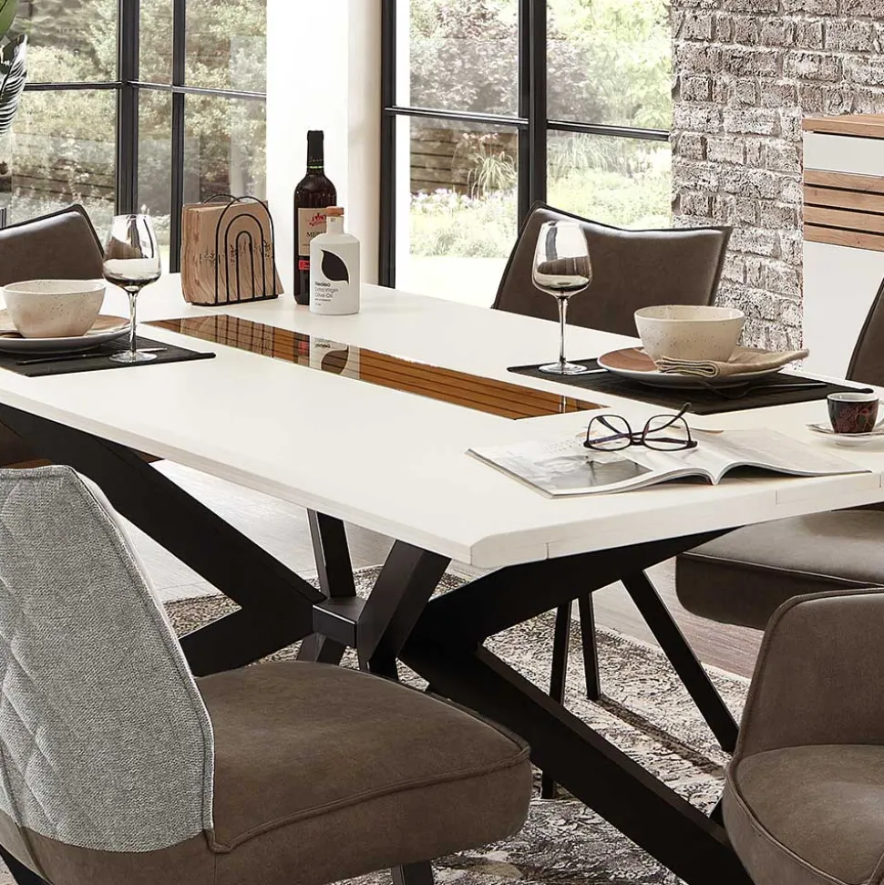 Ein besonderes Highlight der Tischplatte ist die mittig platzierte Absetzung in Paneeloptik, die in Wildeichenoptik gehalten und mit einer Glasauflage versehen ist. Diese einzigartige Gestaltung verleiht dem Tisch einen modernen und zugleich natürlichen Look. Die Tischplatte ist am Rand aufgedoppelt, was nicht nur zur Stabilität beiträgt, sondern auch einen zusätzlichen ästhetischen Reiz bietet. Mit einer Stärke von ca. 1,8 cm und einer maximalen Belastbarkeit von 100 kg ist die Tischplatte äußerst robust und langlebig.