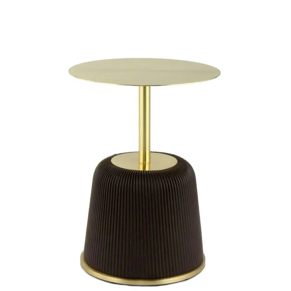Der „Elixar“ Beistelltisch wurde aus Kunstleder, Metall und MDF-Platte gefertigt und überzeugt durch seine langlebige und stabile Bauweise. Die runde Tischplatte aus Metall ist 2 mm stark und in edlem Gold gehalten, wodurch der Tisch einen besonders luxuriösen Eindruck hinterlässt. Das markante Säulengestell besteht aus einer robusten MDF-Basis und einer eleganten Säule aus Gold-Metall. Der Sockelfuß des Tisches bildet das optische Highlight: In einer glockenartigen Form gehalten, ist er mit Kunstleder (100% Polyurethan) in Dunkelbraun bezogen und in einer raffinierten Rillenoptik gestaltet. Diese Details machen den „Elixar“ zu einem echten Hingucker.