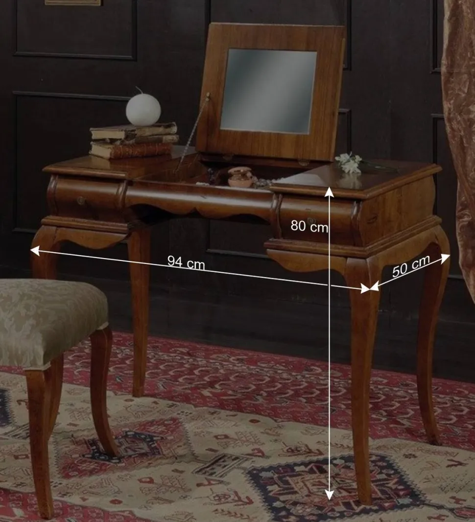 Jedes Detail des „Motiz“ Frisiertisches spricht von Liebe zum Handwerk. Die Oberflächen sind mit echtem Nussbaumholzfurnier belegt und in einem warmen Nussbaumton lackiert, was dem Möbelstück eine edle und authentische Ausstrahlung verleiht. Die absichtlich eingearbeiteten Gebrauchsspuren unterstreichen den Charakter des Barockstils und verleihen dem Stück eine individuelle Note.