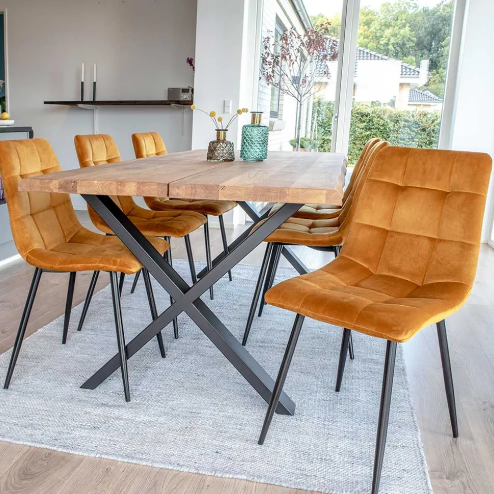 Mit einer Tischplatte aus massivem Eichenholz bringt „Valco“ die Natur in Ihr Esszimmer. Jede Tischplatte ist etwa 4 cm stark und längs geteilt, was nicht nur eine ansprechende Optik, sondern auch ein individuelles Erscheinungsbild bietet. Besonders hervorzuheben sind die einzigartig gewachsenen Baumkanten, die bei jedem Tisch anders verlaufen, da sie direkt aus dem Baumstamm geschnitten werden. Diese Kanten bringen die natürliche Schönheit des Holzes besonders zur Geltung und machen jeden Tisch zu einem echten Unikat. Das X-förmige Stahlgestell in Schwarz sorgt dabei für außergewöhnliche Stabilität und eine interessante Linienführung – ein echter Hingucker, der Design und Funktion perfekt vereint. Diese Konstruktion bietet zudem den Vorteil einer optimalen Gewichtsverteilung und eines sicheren Stands, selbst bei hoher Beanspruchung.