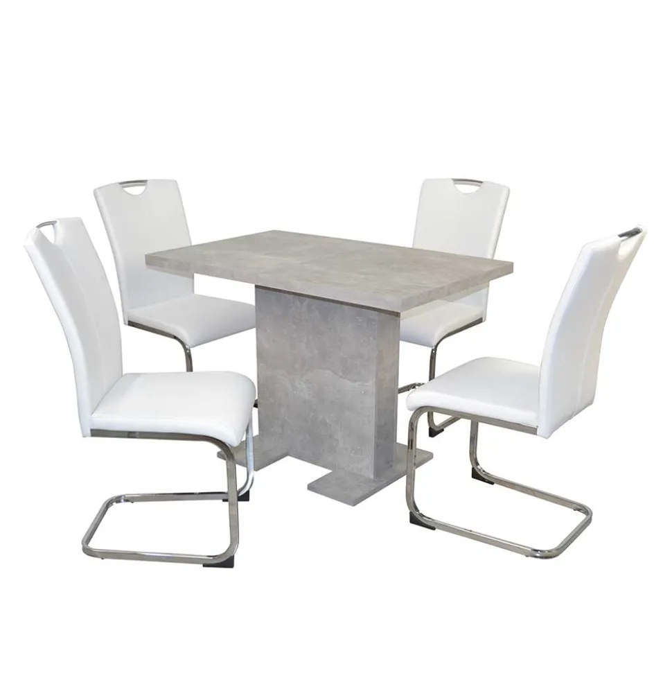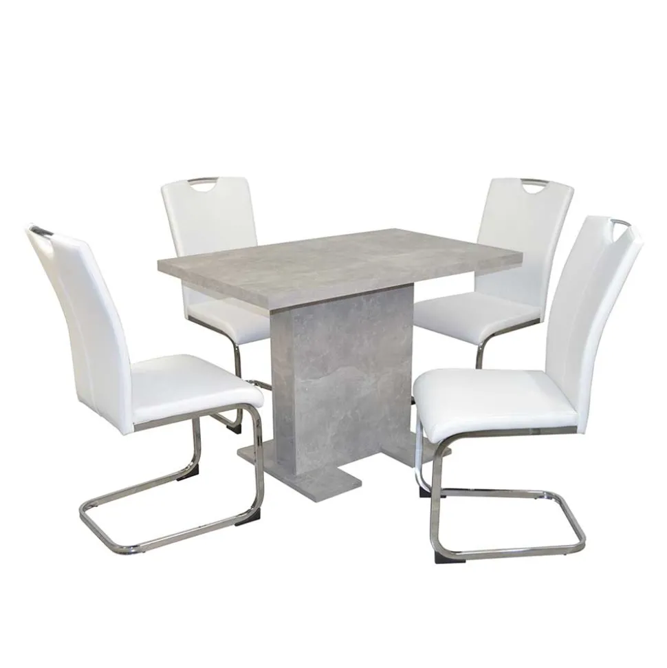 Bestehend aus einem funktionalen Esstisch und vier formvollendeten Stühlen, präsentiert sich die Sitzgruppe Zyana als moderne Lösung für stilvolle Essbereiche. Die Kombination aus eleganten Weißtönen, markanter Beton-Optik und glänzendem Chrom verleiht dem Raum eine klare, zeitgemäße Linie – perfekt für Liebhaber urbanen Wohnens mit Klasse. Ob geselliges Abendessen oder morgendlicher Kaffee – dieses Ensemble schafft die Bühne für Ihre schönsten Wohnmomente.