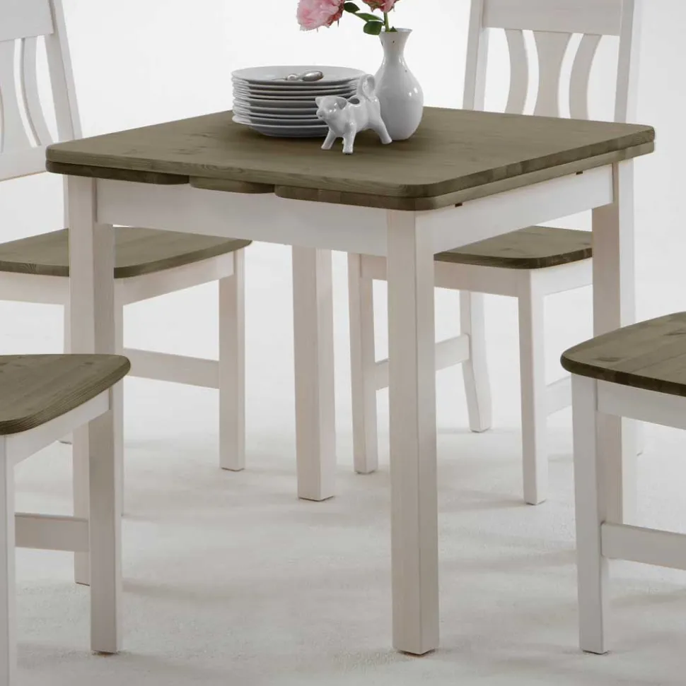 Massives Kiefernholz bildet das Herzstück dieser Möbelserie. Bekannt für seine Stabilität und die natürliche Maserung, bringt Kiefer nicht nur optische Wärme in den Raum, sondern überzeugt auch durch Robustheit und Widerstandsfähigkeit. Die Tischplatte sowie die Sitzflächen der Stühle präsentieren sich in einem eleganten Grauton, während alle weiteren Oberflächen weiß gebeizt und anschließend lackiert wurden.