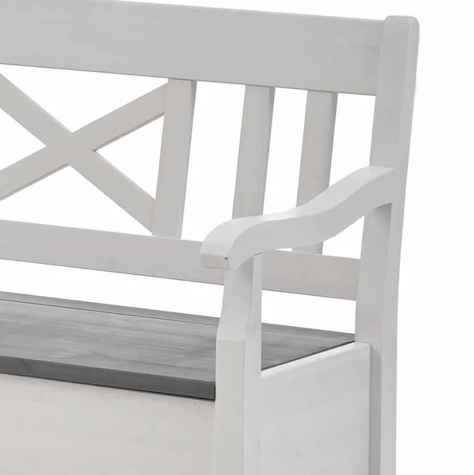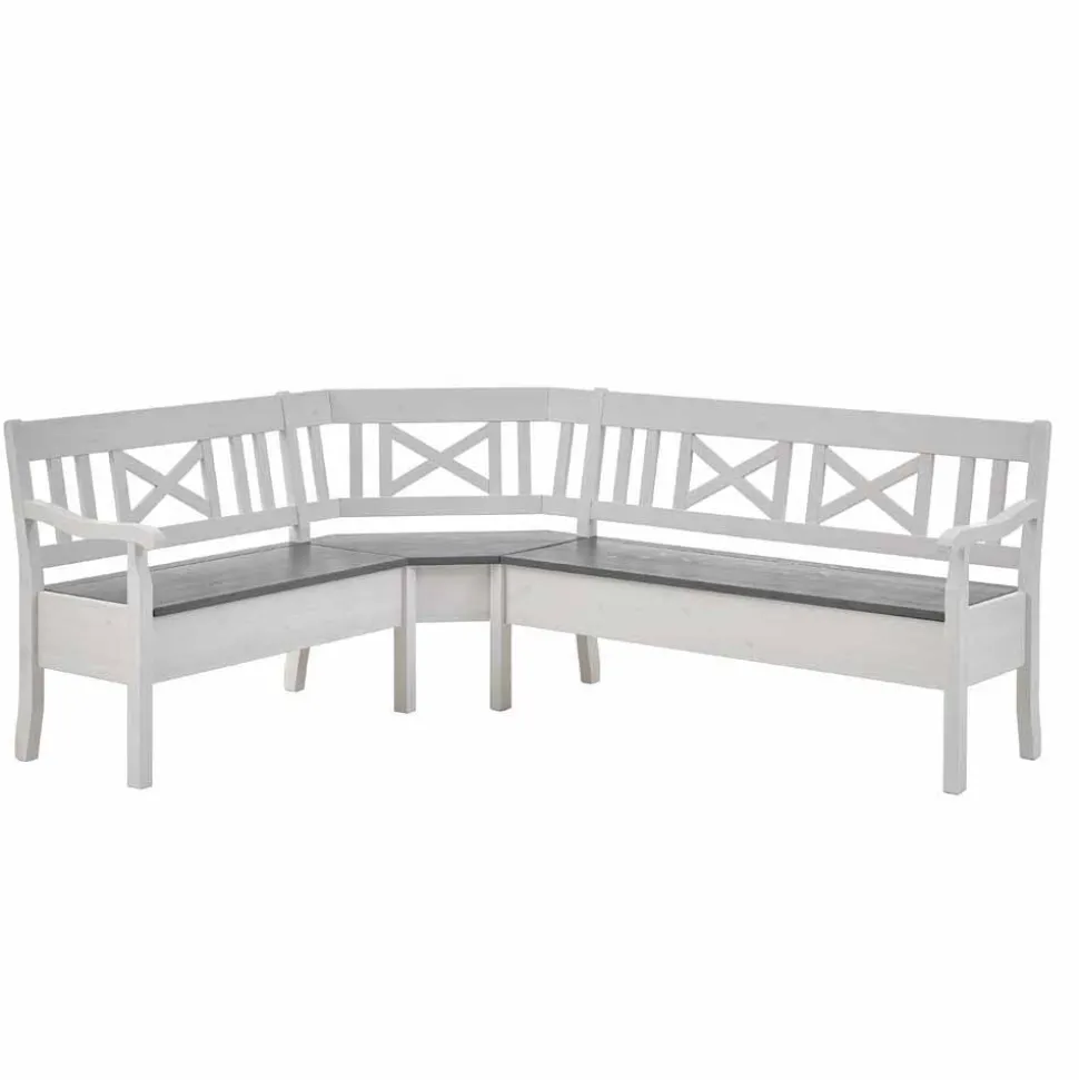 Die Oberflächen der Eckbank sind in einem stilvollen Weiß gehalten, während die Sitzfläche in einem eleganten Grauton gebeizt und lackiert wurde. Die durchscheinende Maserung verleiht dem Möbelstück eine natürliche und lebendige Optik, die perfekt zu modernen, rustikalen oder klassischen Einrichtungsstilen passt. Die hochwertige Lackierung schützt das Holz und sorgt für eine pflegeleichte Oberfläche, die auch im Alltag problemlos zu reinigen ist.