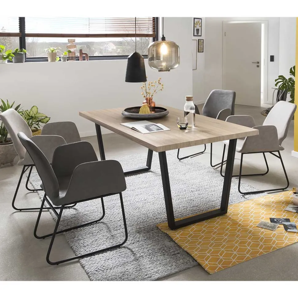 Warme Holztöne wie Sonoma Eiche verleihen dem Tisch eine einladende Ausstrahlung, während die hell- und dunkelgrauen Kunstlederbezüge der Stühle für optische Tiefe und elegante Zurückhaltung sorgen. Diese Farbgestaltung wirkt nicht nur modern, sondern auch beruhigend und stilvoll. Ergänzt wird das Ensemble durch die schwarzen Gestelle, die mit ihrer matten Oberfläche einen edlen Kontrast setzen und zugleich eine gewisse Bodenständigkeit vermitteln. Farbharmonie, die den Alltag verschönert.
