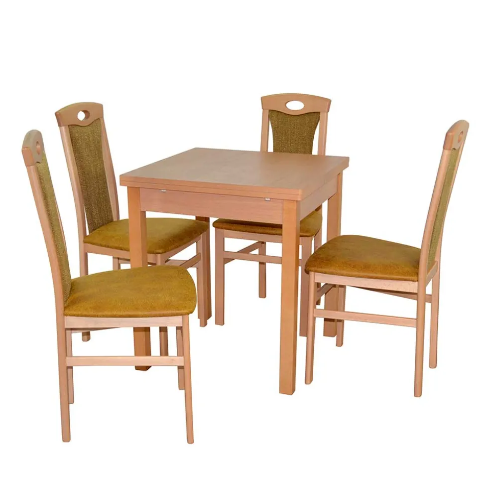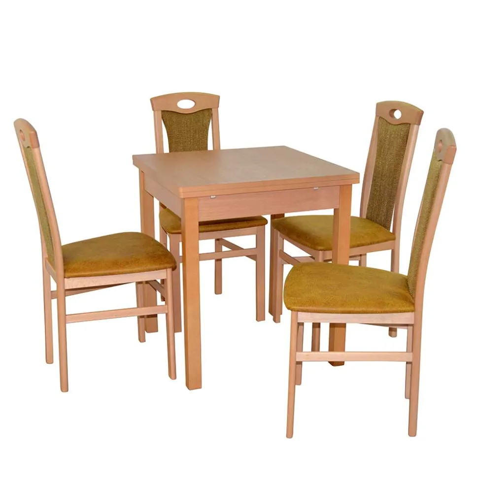 Mit vier elegant gestalteten Stühlen und einem raffiniert erweiterbaren Tisch bringt die Sitzgruppe „Kerneta“ nicht nur stilvolle Struktur in Ihr Esszimmer, sondern schafft auch eine Atmosphäre, in der Gastlichkeit und Alltag perfekt miteinander verschmelzen. Die warmen Buchefarben in Kombination mit dem lebendigen Ockergelb verleihen dem Raum einen Hauch von Behaglichkeit und sonnigem Charme – ideal für alle, die stilvolles Wohnen und funktionalen Komfort zu schätzen wissen.