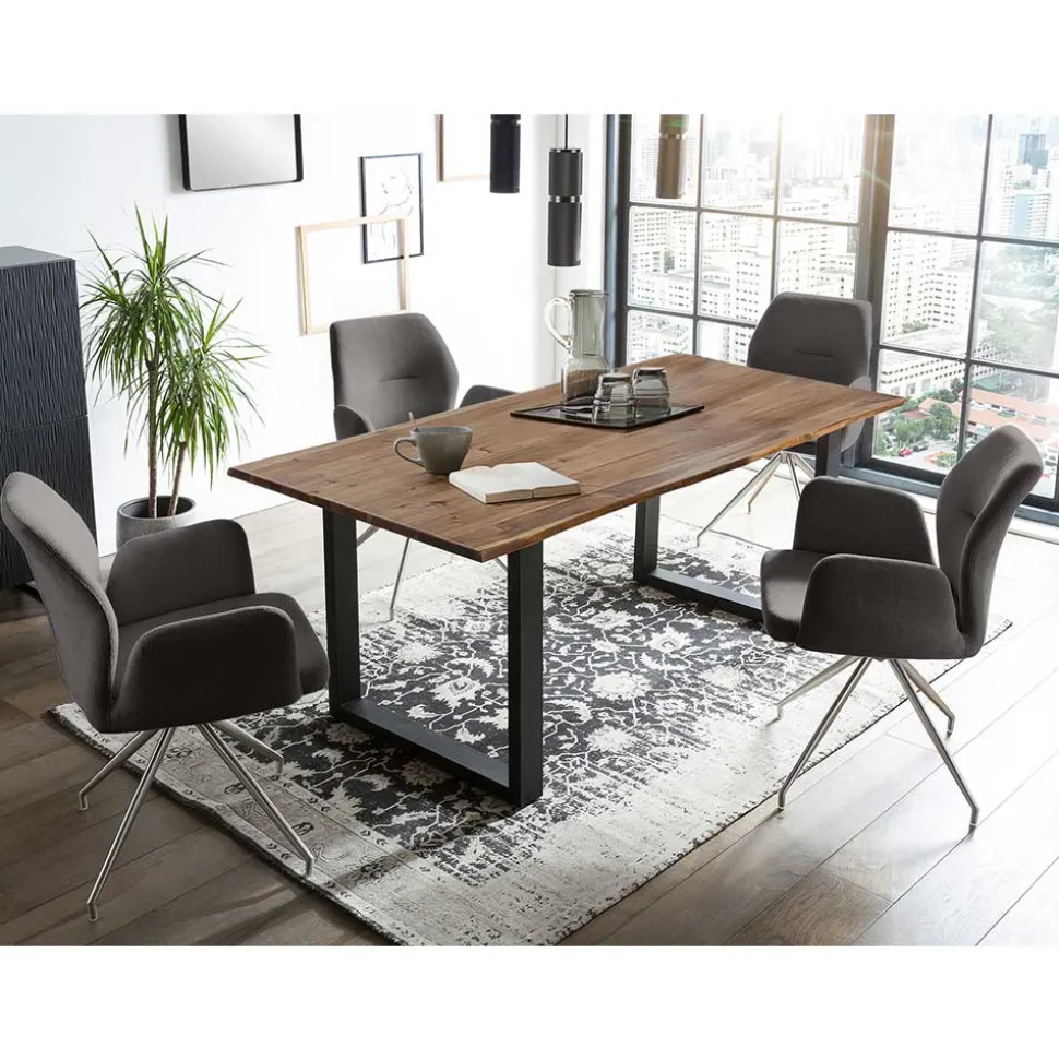 Verleihen Sie Ihrem Essbereich eine charaktervolle Note mit dem Esstisch-Set „Valbera“. Die Kombination aus hochwertigem Akazienholz, kühlem Metall und strapazierfähigem Strukturstoff vereint rustikale Natürlichkeit mit industriellem Charme. Die warme Walnuss-Braun-Tönung der massiven Tischplatte und das tiefdunkle Gestell setzen markante Akzente, während die dunkelgrauen Drehstühle mit ihrer bequemen Polsterung und durchdachten Ergonomie für höchsten Komfort sorgen. Dieses Set ist nicht nur ein Blickfang, sondern auch ein funktionales Highlight für stilbewusste Genießer.