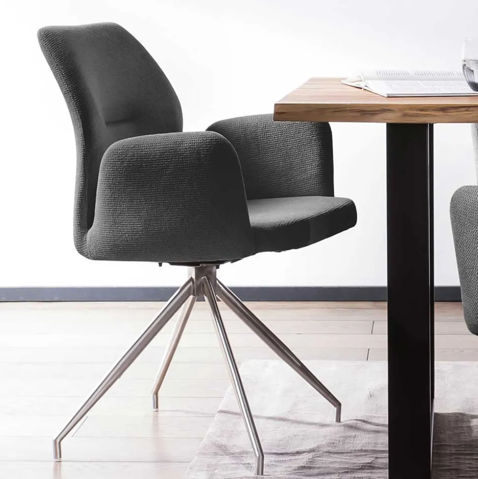 Die vier dazugehörigen Drehstühle sind mit einem strapazierfähigen Strukturstoff in Dunkelgrau bezogen (100 % Polyester). Mit einer Martindale-Zahl von 50.000 überzeugt der Bezug durch hohe Abriebfestigkeit und ist somit bestens für den Alltag geeignet. Die ergonomisch geformten Rücken- und Armlehnen mit dekorativen Ziernähten bieten optimalen Sitzkomfort, während die weiche Schaumstoffpolsterung ein angenehmes Sitzgefühl garantiert. Das Spider-Vierfußgestell aus rostfreiem Edelstahl sorgt für sicheren Stand und eine moderne Optik.