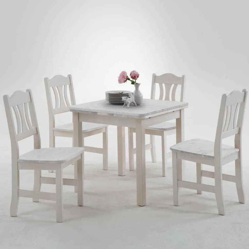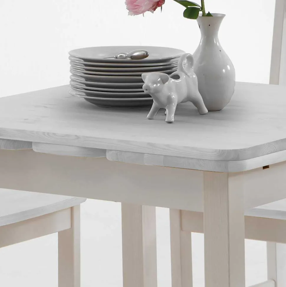 Vier Stühle und ein erweiterbarer Tisch – diese hochwertige Sitzgruppe „Vironegras“ bringt ländliche Gemütlichkeit und zeitlose Eleganz in Ihr Esszimmer. Liebevoll gestaltet im klassischen Landhausstil, versprüht dieses Ensemble Wärme, Natürlichkeit und eine charmante Wohlfühlatmosphäre. Die Verbindung aus massivem Kiefernholz, detailverliebter Verarbeitung und einer edlen weiß gebeizten und lackierten Oberfläche macht diese Sitzgruppe zum Herzstück jedes Raumes.