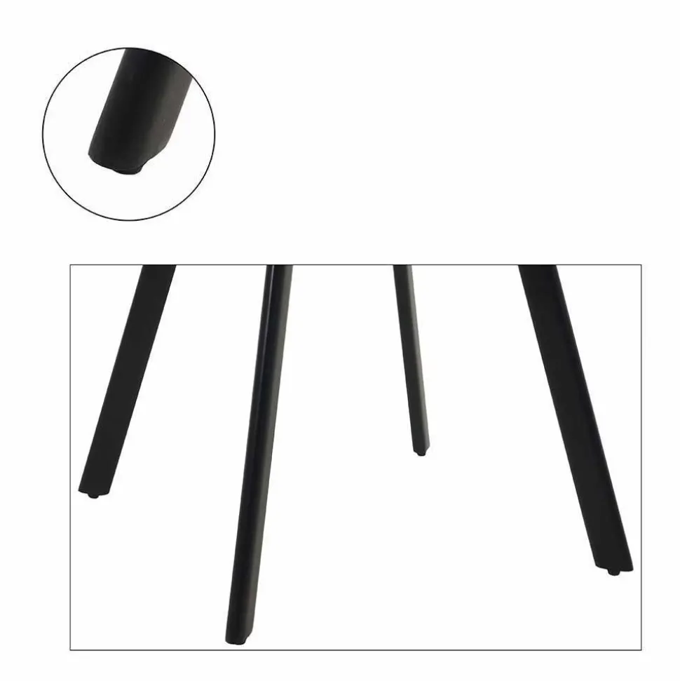 Die Stuhlgestelle sind aus schwarz pulverbeschichtetem Metall gefertigt – eine Technik, bei der der Lack elektrostatisch aufgetragen und anschließend bei hoher Temperatur eingebrannt wird. Dadurch entsteht eine besonders widerstandsfähige, gleichmäßige Oberfläche. Das Tischgestell wurde schwarz lackiert und bietet nicht nur optische Tiefe, sondern auch eine glatte, pflegeleichte Beschichtung mit hoher Lebensdauer.