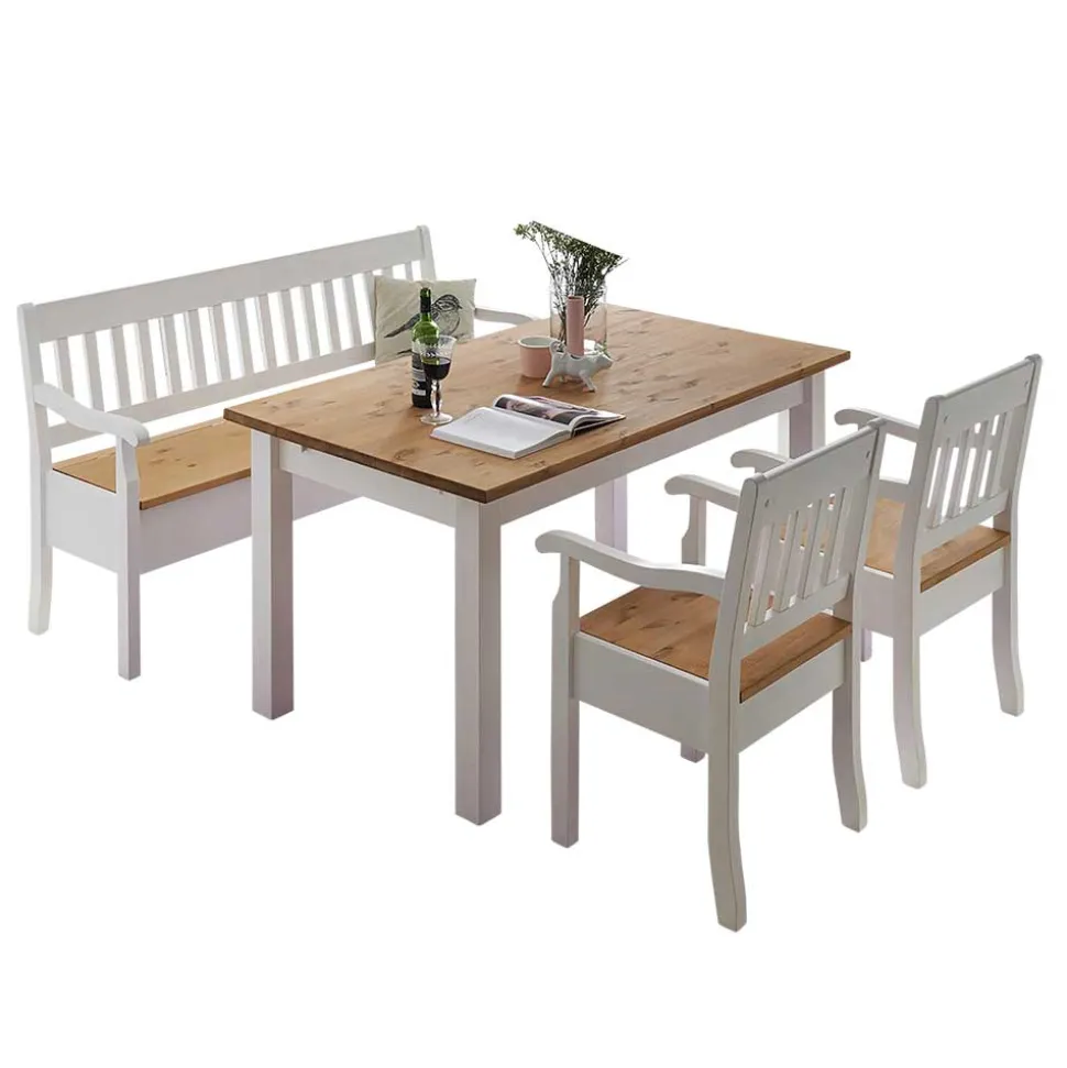 In ansprechender Kombination von Weiß und Kiefer Laugenfarben gestaltet, bringt diese Sitzgruppe frischen Wind in Ihr Zuhause. Massives nordisches Kiefernholz, das für Haltbarkeit und Stärke steht, verleiht jedem Raum eine warme, natürliche Ausstrahlung. Die authentische Landhausatmosphäre wird durch die Farben und die natürliche Maserung des Holzes zusätzlich betont.