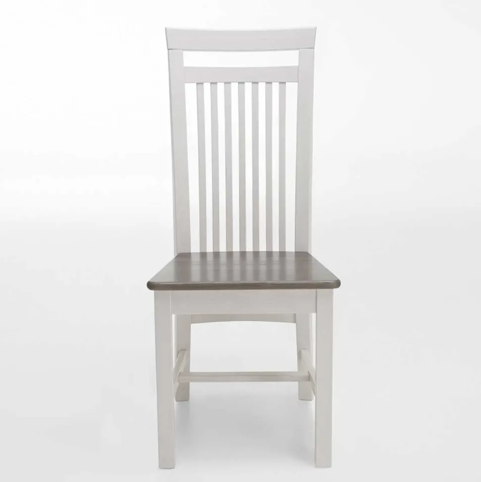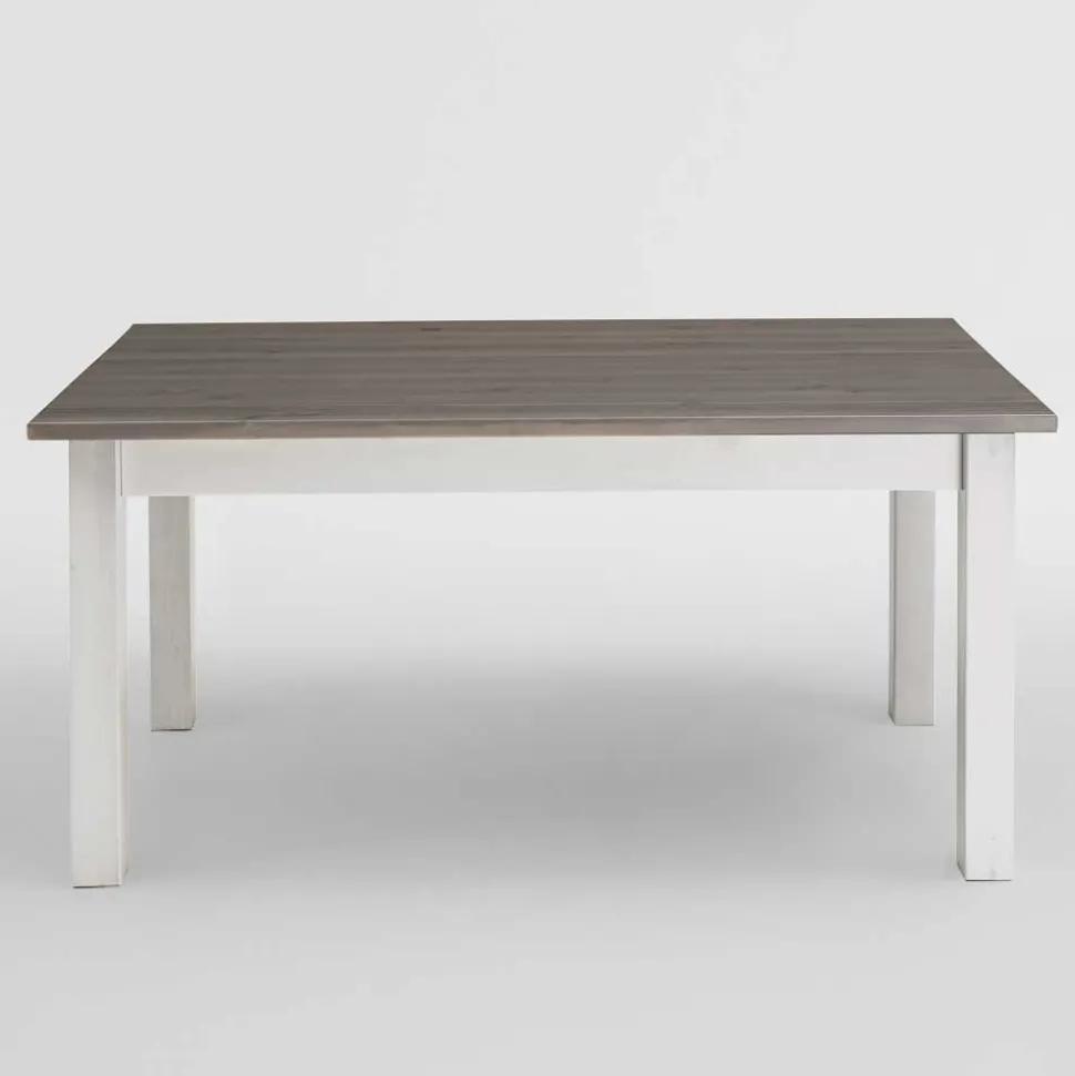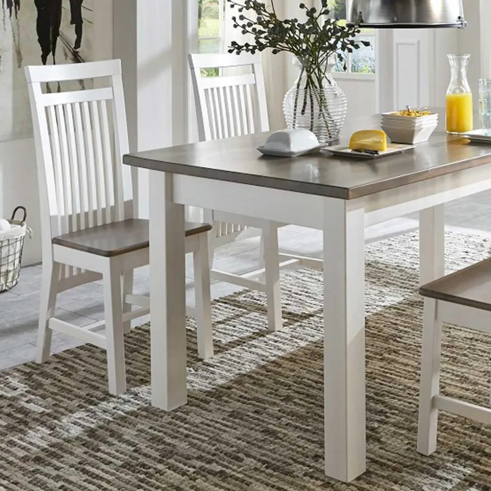 Die Oberflächen sind in einem edlen Weiß gehalten, während die Tischplatte und Sitzflächen in einem sanften Grauton lackiert sind. Die durchscheinende Holzmaserung verleiht den Möbeln eine lebendige, natürliche Optik. Diese zeitlose Farbgestaltung fügt sich mühelos in unterschiedlichste Wohnstile ein – ob klassisch, modern oder rustikal.