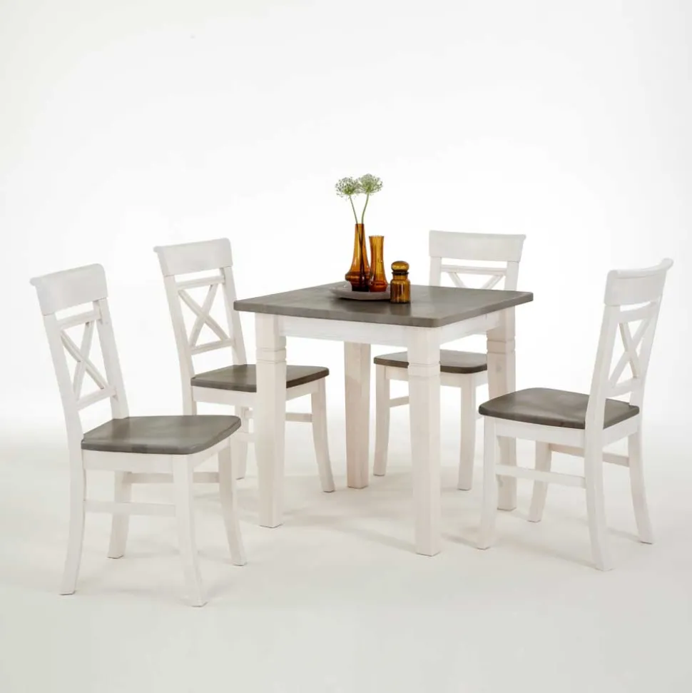 Die Esstischgruppe Yoan besteht aus einem quadratischen Esstisch und vier stilvollen Stühlen – ideal für kleine Räume oder gemütliche Essbereiche. Der Tisch misst 78×78 cm und bietet ausreichend Platz für vier Personen. Dank der soliden Tischplattenstärke von 3 cm und des stabilen Vierfußgestells mit dekorativen Fräsungen steht er fest und sicher. Abgerundete Tischkanten sorgen für ein angenehmes Gefühl und zusätzlichen Komfort.