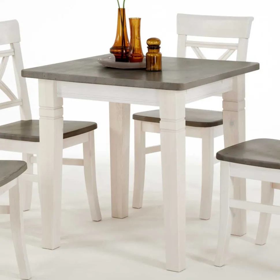 Die Kombination aus weiß lackierten Flächen und graubeizten, lackierten Tisch- und Sitzflächen macht die Esstischgruppe zu einem echten Blickfang. Die durchscheinende Holzmaserung sorgt für eine authentische, natürliche Optik und unterstreicht den gemütlichen Charakter des Landhausstils. Die helle Farbgestaltung lässt den Essbereich freundlich und einladend wirken und lässt sich wunderbar mit verschiedenen Wohnstilen kombinieren.