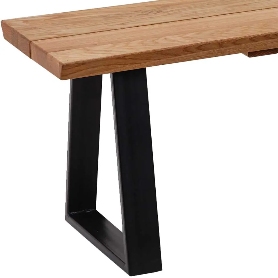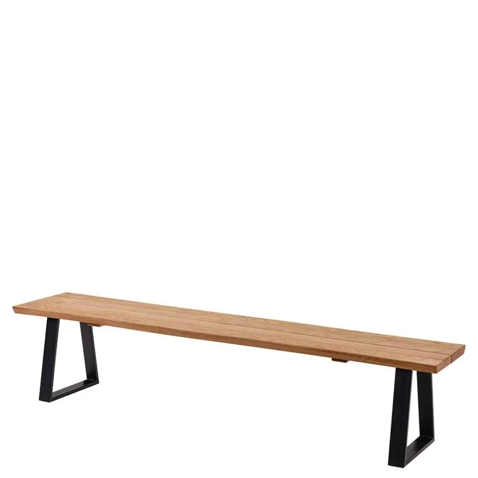 Das markante, trapezförmige Bügelgestell aus schwarz pulverbeschichtetem Metall sorgt für eine hohe Belastbarkeit von 300 kg und eine standfeste Konstruktion. Durch die gute Materialqualität und die originelle Optik ist die Sitzbank „Sympatia“ ein echter Hingucker in jedem Raum.