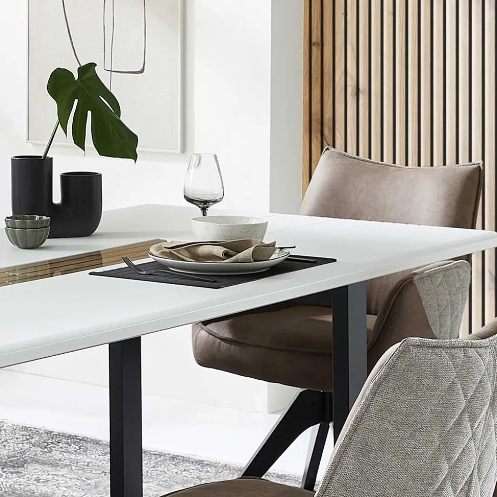 Das Tischgestell aus matt schwarzem, pulverbeschichtetem Metall sorgt für Stabilität und Robustheit. Die Pulverbeschichtung schützt das Metall vor Korrosion und Abnutzung, was die Langlebigkeit des Bügelgestells erheblich erhöht. Zusätzlich verleiht die matte Optik dem Tisch eine moderne und edle Ausstrahlung. Eine dekorative Absetzung in Wildeichenoptik mit Glasauflage in der Mitte der Tischplatte setzt natürliche Akzente und verleiht dem Tisch eine besondere Note. Die aufgedoppelten Kanten verstärken nicht nur die Stabilität der Tischplatte, sondern tragen auch zur ansprechenden Optik bei.