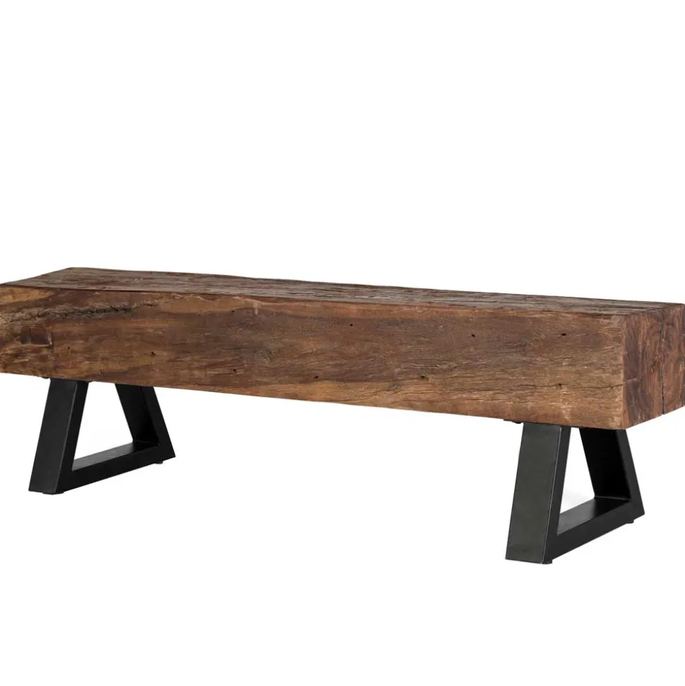 Für den sicheren Stand sorgen zwei markante Metall-Bügelbeine im Triangeldesign, die in edlem Schwarz lackiert sind. Dieses geometrische Untergestell verleiht der Bank nicht nur hohe Stabilität, sondern auch eine moderne, industrielle Note, die perfekt mit der Natürlichkeit des Holzes harmoniert. Die prägnante Formensprache macht „Evinele“ zu einem Möbelstück, das zugleich robust und elegant wirkt.