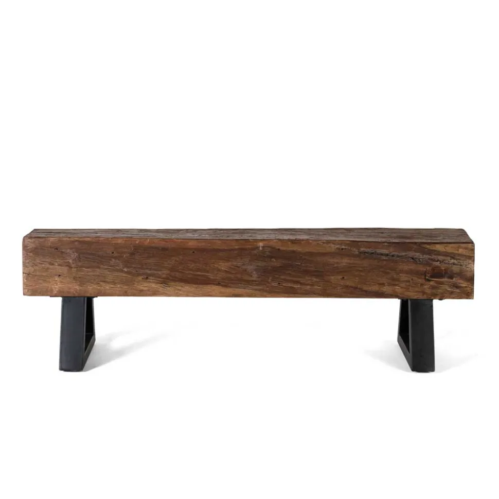 Jede „Evinele“ Bank erzählt ihre eigene Geschichte: Der Sitz besteht aus einem massiven Balken aus hochwertigem Recyclingholz, das durch seine grobe Struktur, Risse, Astlöcher und natürliche Unebenheiten seinen ganz besonderen Charakter erhält. Diese Spuren des Lebens verleihen dem Möbelstück einen authentischen, charmanten Look – jede Bank ist ein handgefertigtes Unikat mit einzigartiger Maserung und Patina.