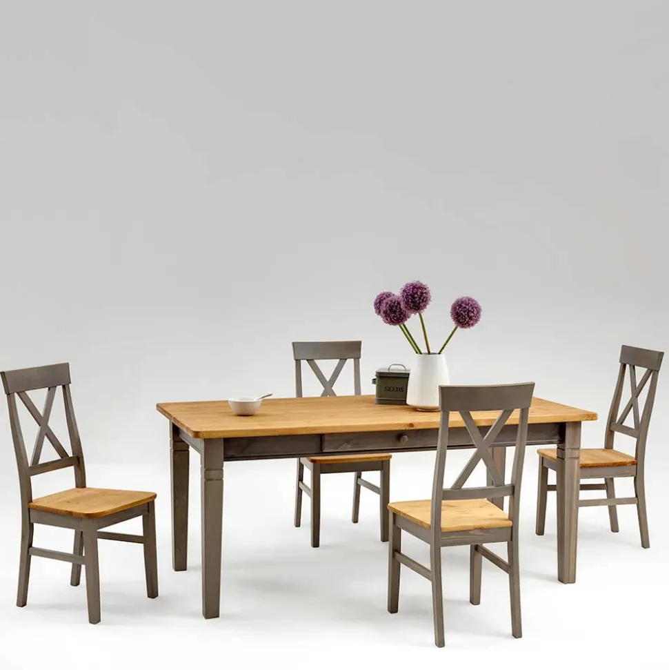Gefertigt aus massivem Kiefernholz, steht „Jytte“ für Qualität, Stabilität und Nachhaltigkeit. Die Tischplatte sowie die Sitzflächen der Stühle wurden laugenfarbig gebeizt und anschließend geölt – eine Behandlung, die die natürliche Maserung hervorhebt, das Holz schützt und ihm eine warme, samtige Oberfläche verleiht. Die restlichen Flächen sind in einem eleganten Grau gebeizt und lackiert. Die Beizung sorgt auch hier für das Durchscheinen der typischen Holzstruktur, während die Lackierung eine widerstandsfähige, pflegeleichte Oberfläche schafft. So verbinden sich Ästhetik und Funktion auf ideale Weise.