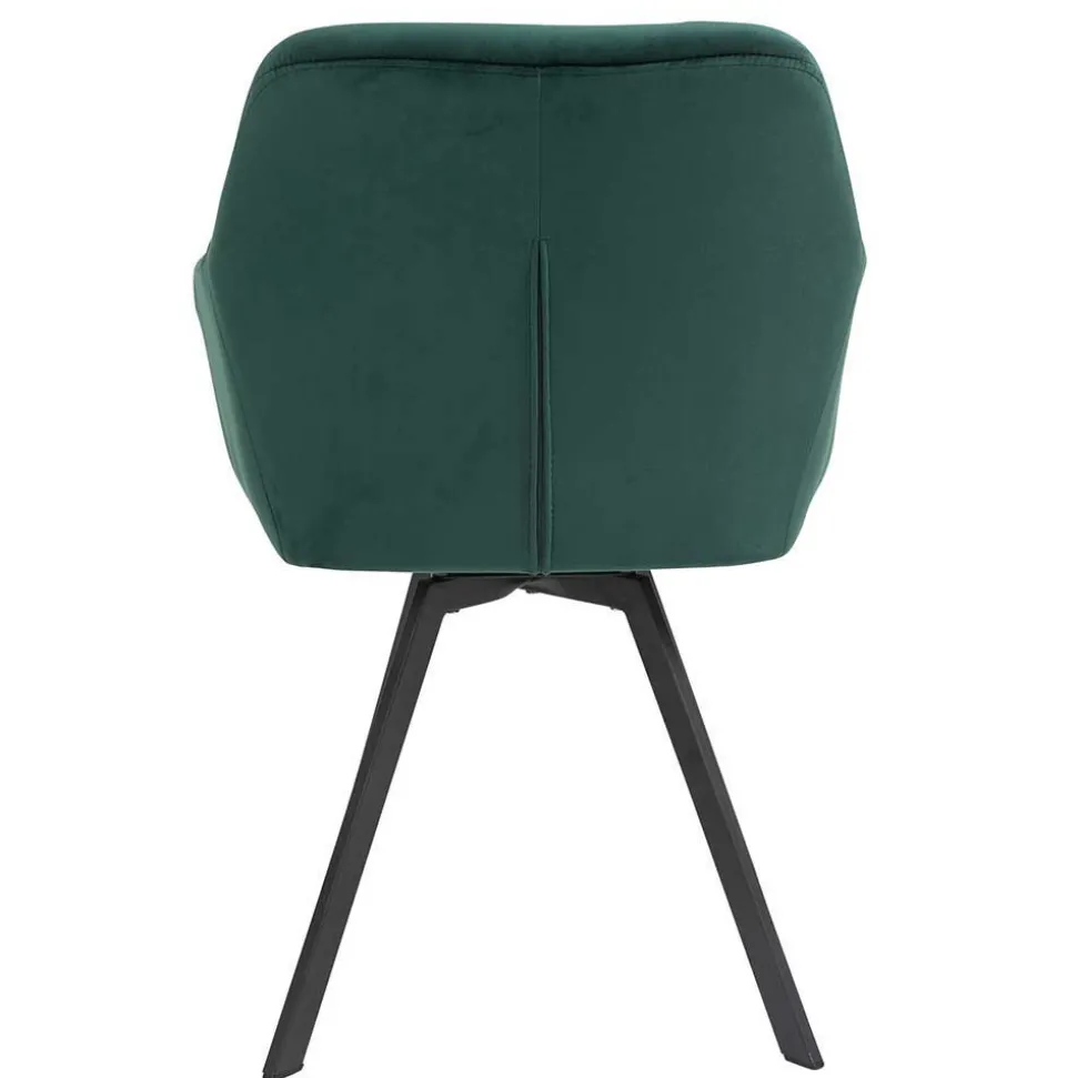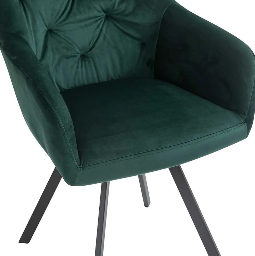 Die ergonomisch geformten Armlehnstühle bieten höchsten Sitzkomfort. Die großzügige Schaumstoffpolsterung sorgt für ein angenehmes Sitzgefühl, während die breite Rückenlehne mit dekorativer Knopfheftung zusätzlichen Halt gibt. Ein besonderes Highlight: Die Sitzfläche ist um 360 Grad drehbar, sodass Sie sich mühelos zur Seite drehen können, ohne den Stuhl zu verrücken. Das abgeschrägte Vierfußgestell aus schwarz pulverbeschichtetem Metall garantiert Stabilität und ist bis zu 110 kg belastbar.