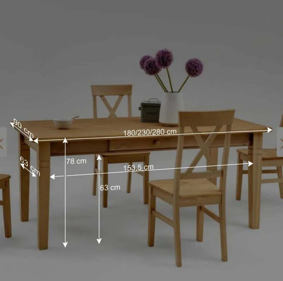 - 002: Breite: 280 / verlängerbar um je 50 cm, von 180 bis auf 280 cm / mit zwei Ansteckplatten / für acht Personen