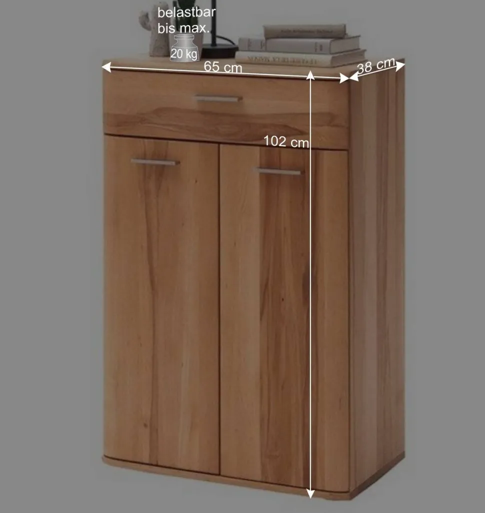 Ober- und Unterboden sind vorne mit massiven Anleimern verstärkt, was die Stabilität erhöht. Mit den kompakten Abmessungen von 65 cm Breite, 102 cm Höhe und 38 cm Tiefe passt das Vertiko auch in schmalere Flurflächen und punktet mit einer belastbaren Deckplatte von bis zu 20 kg.