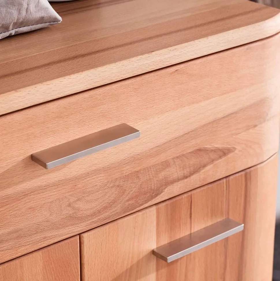 Das Vertiko ist teilmassiv gefertigt: Die Front besteht aus Kernbuche Massivholz, der Korpus aus Spanplatte mit echtholzfurnierter Kernbuche-Oberfläche. Flache Holzfüße (6 x 1,5 x 6 cm) sorgen für stabilen Stand, während die silberfarbenen Metallgriffleisten das Design geschmackvoll ergänzen. Eine zusätzliche Kippsicherung wird für mehr Sicherheit mitgeliefert.