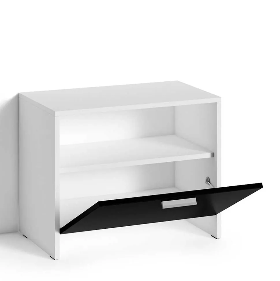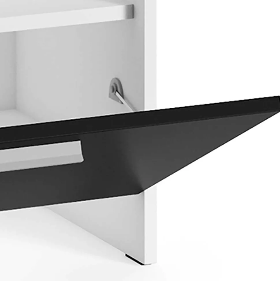Hinter der Klappe verbirgt sich ein verstellbarer Einlegeboden mit einer beeindruckenden Belastbarkeit von bis zu 8 kg. Die kontrastreiche Farbgebung und die dezente Kunststoffgriffleiste in Silberfarben setzen optische Akzente und machen die Flurbank zu einem echten Blickfang.