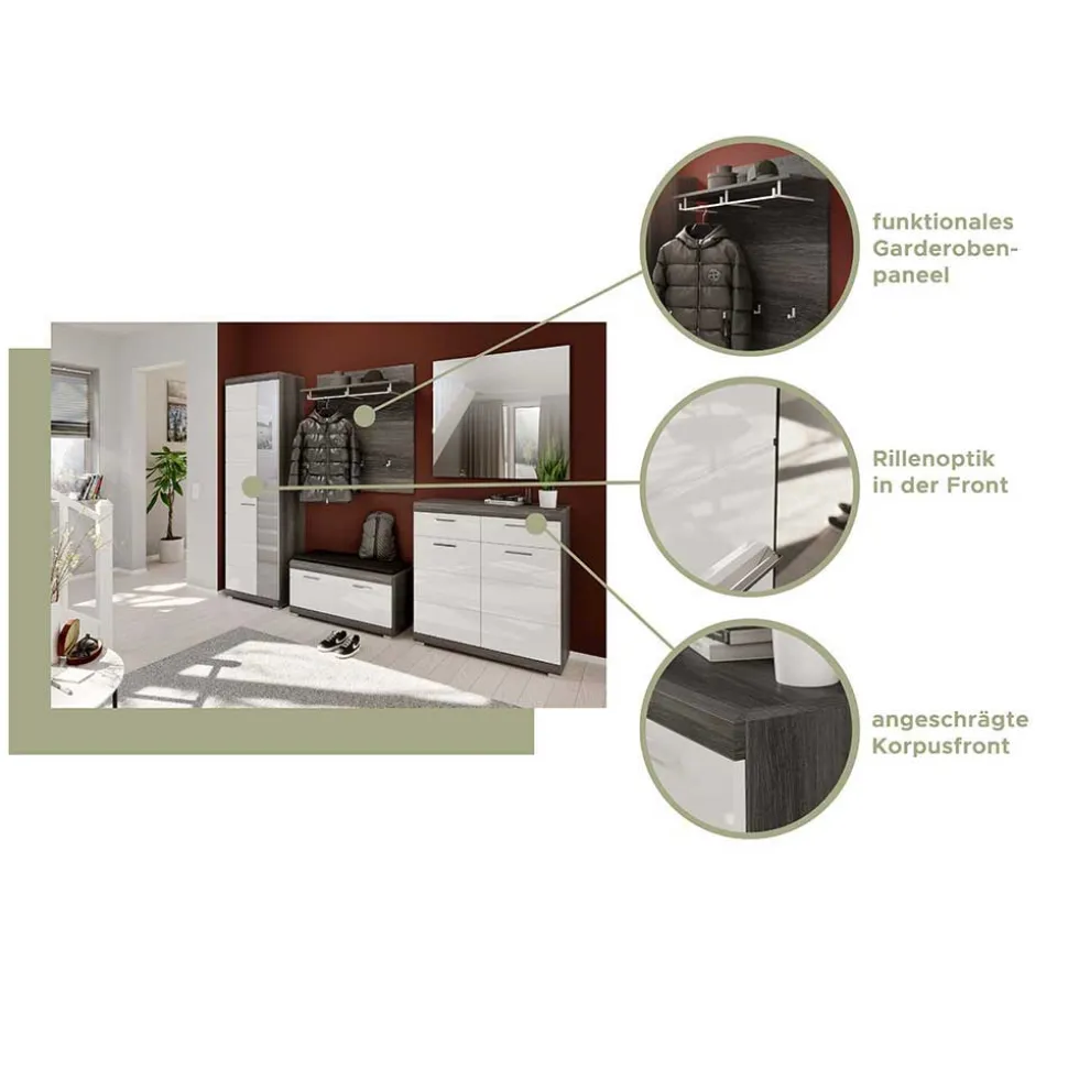 Mitten im Eingangsbereich wird sie zum ersten Blickfang und praktischen Helfer im Alltag: die Flurbank „Nancys“ vereint ein elegantes, modernes Design mit durchdachter Funktionalität. Ihre formschöne Kombination aus hochglänzendem Weiß und Holzoptik in Rauchgrau verleiht jedem Flur einen Hauch urbaner Eleganz. Der moderne Look zeigt sich in klaren Linien, zurückhaltender Farbgebung und der raffinierten Rillenstruktur der Fronten, die dem Möbelstück zusätzliche Tiefe und Charakter verleihen.
