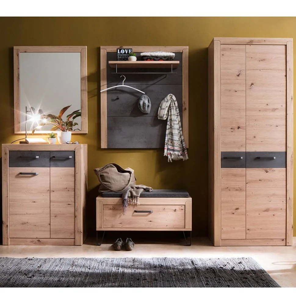 - Zeitgemäße Garderobenmöbel in Wildeichefarben und dunkelgrauer Metalloptik