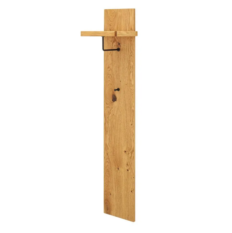 Die zwei Garderobenpaneele überzeugen mit ihrer kompakten Bauweise und durchdachten Ausstattung. Sie verfügen jeweils über einen oberen Hutboden, eine Kleiderstange aus pulverbeschichtetem Metall in Schwarzgrau sowie einen runden Kleiderhaken im unteren Bereich. Gefertigt aus Rückwänden mit Wildeiche Furnier und Blendleisten aus Balkeneiche Massivholz, punkten die Paneele mit ihrem natürlichen Design und ihrer Funktionalität. Jedes Paneel misst 30 cm Breite, 168 cm Höhe und 30 cm Tiefe.
