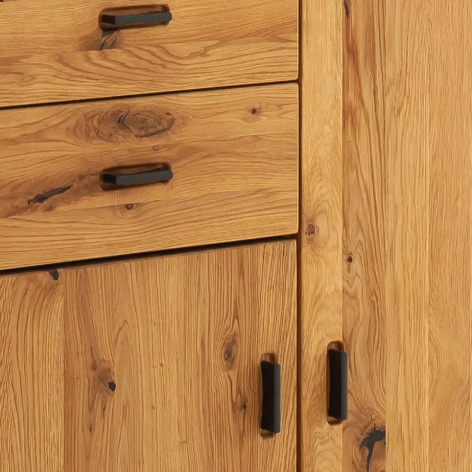 - Aus Balkeneiche Massivholz (Front), Spanplatte (Korpus) und Spiegelglas hergestellt