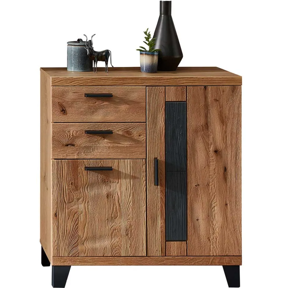 - Massivholz geschroppt und lackiert, Absetzung in Dunkelgrau, durchgehende Lamellen, Spanplatte foliert in Holzoptik, Metall pulverbeschichtet in Anthrazit