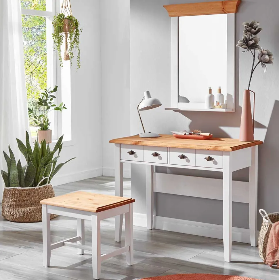 Entdecken Sie das ansprechend gestaltete Frisiertisch & Hocker & Spiegel Set „Sibiuta“ – eine perfekte Symbiose aus modernem Landhaus Charakter und zeitloser Eleganz.