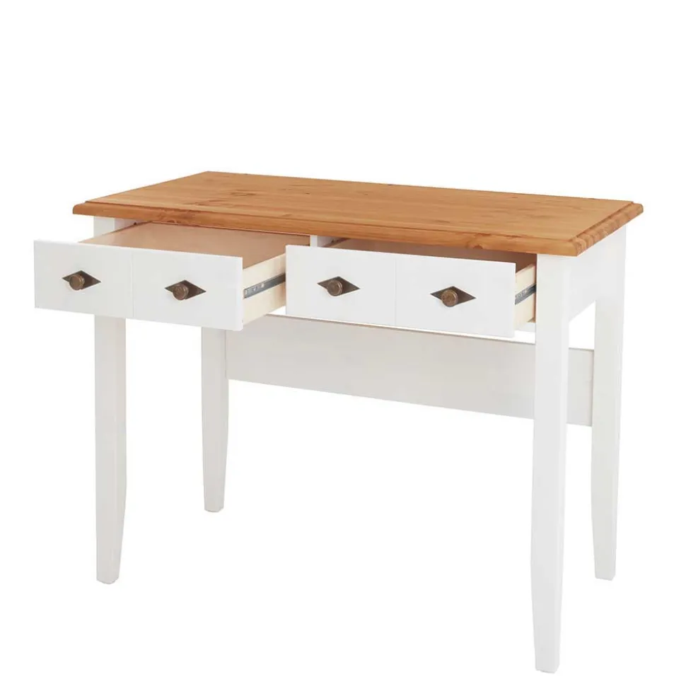 Der Frisiertisch zeichnet sich durch eine massive Tischplatte mit einer Stärke von ca. 2,5 cm aus. Zwei Schubladen mit Metallauszug bieten praktischen Stauraum und sind mit charmanten Metall Knopfgriffen in Altmessingfarben verziert. Die Front ist in einer ansprechenden vier Schubladen Optik gestaltet. Die Schubkästen und Möbelrückwand bestehen aus hochwertigem Sperrholz. Eine Knieraumblende sowie leicht angeschrägte Vierfußgestelle unterstreichen die funktionale Raffinesse des Möbelstücks.