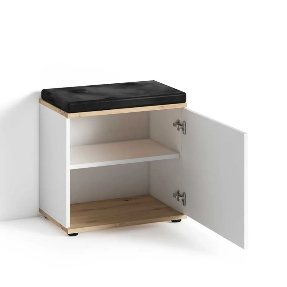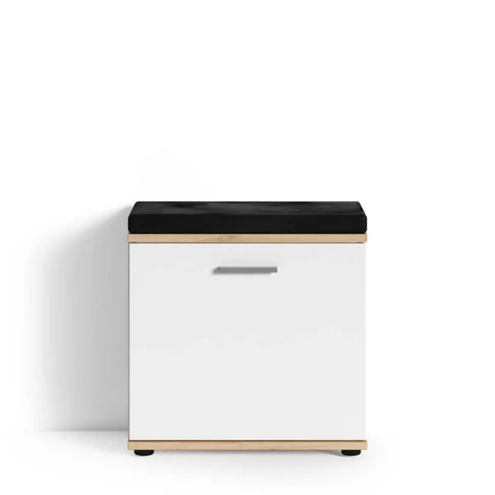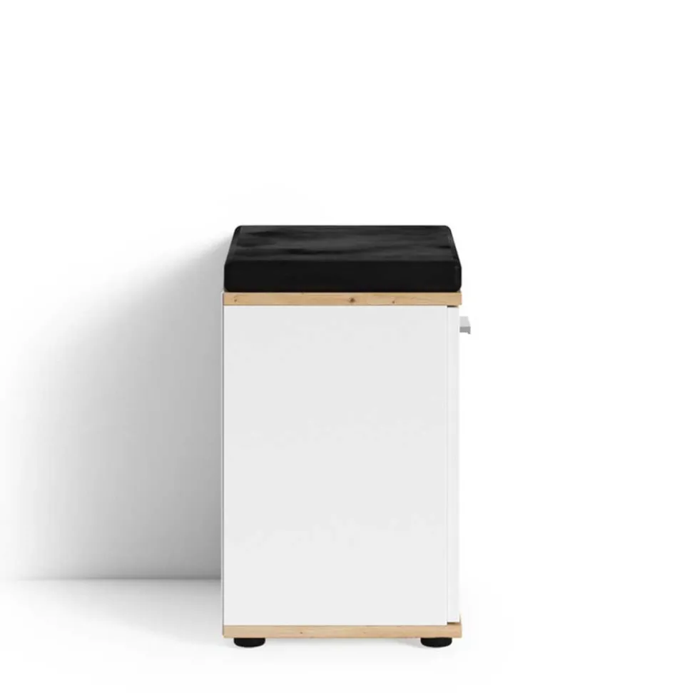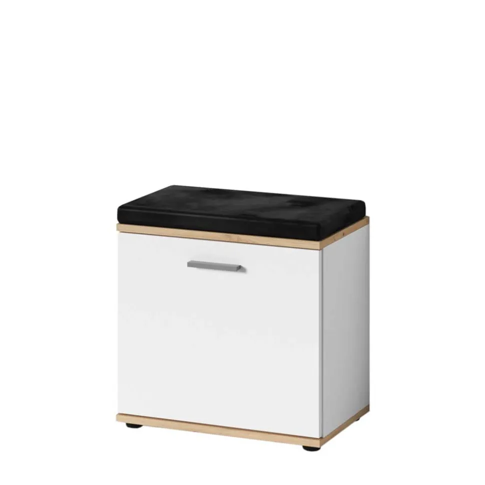 Die Garderobenbank „Yumagno“ wurde aus hochwertigem Holzwerkstoff gefertigt und präsentiert sich mit einem schwarzen Kunstlederbezug aus 100 % Polyurethan. Die Oberflächen in Weiß und Holzoptik Wildeiche sind melaminbeschichtet und verleihen der Bank eine solide Qualität. Die Sitzfläche ist dabei schaumstoffgepolstert, um Ihnen höchsten Sitzkomfort zu bieten.