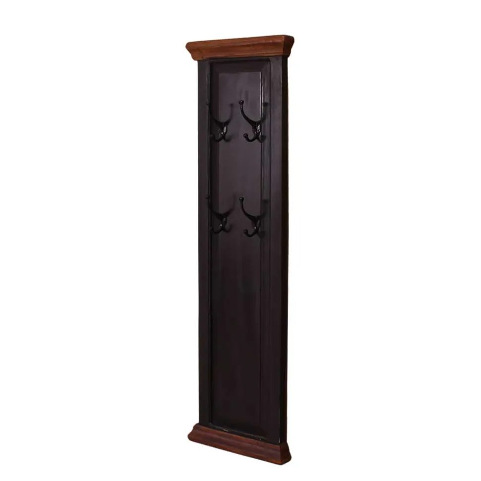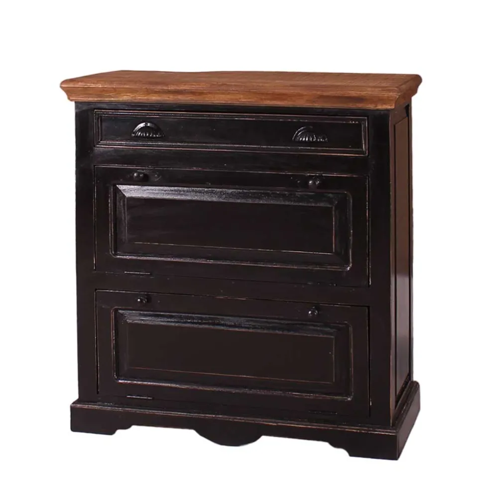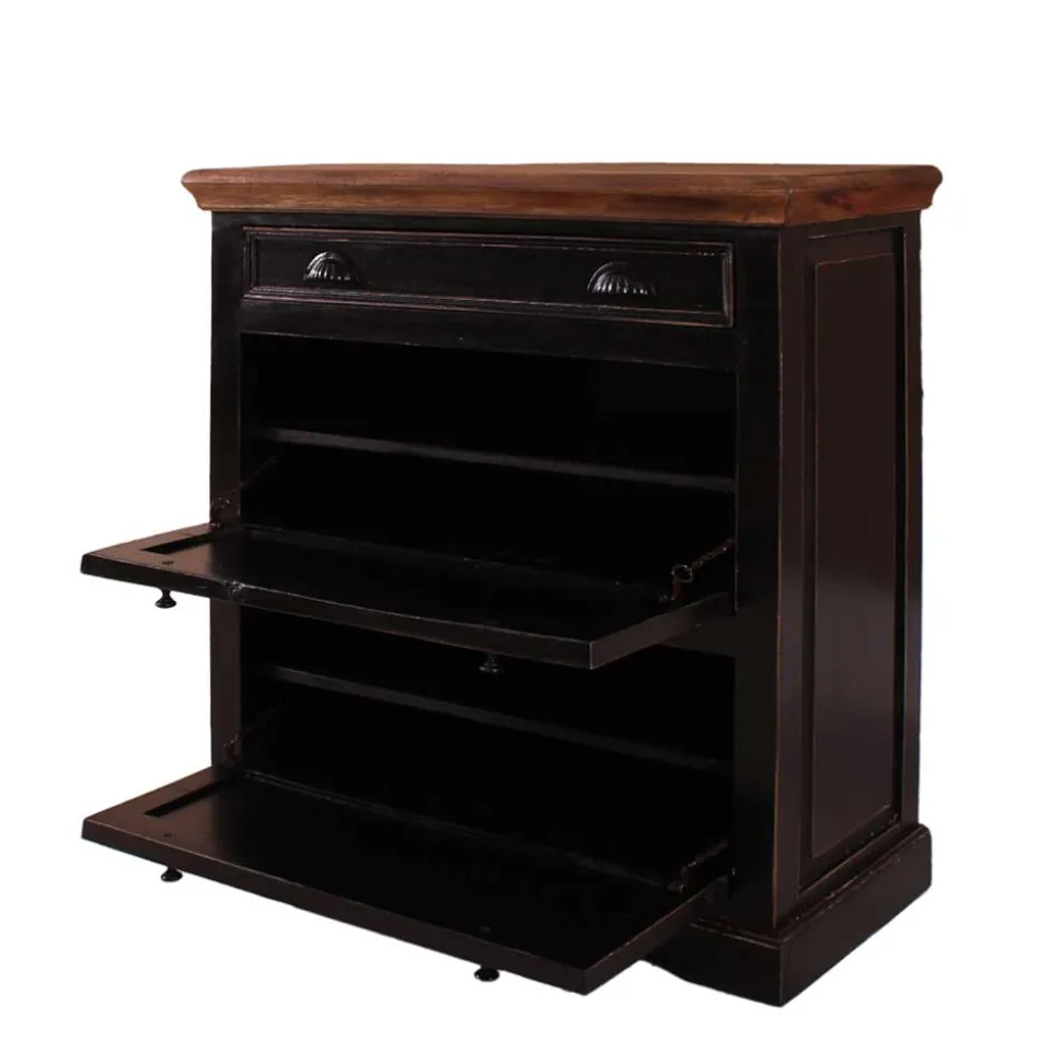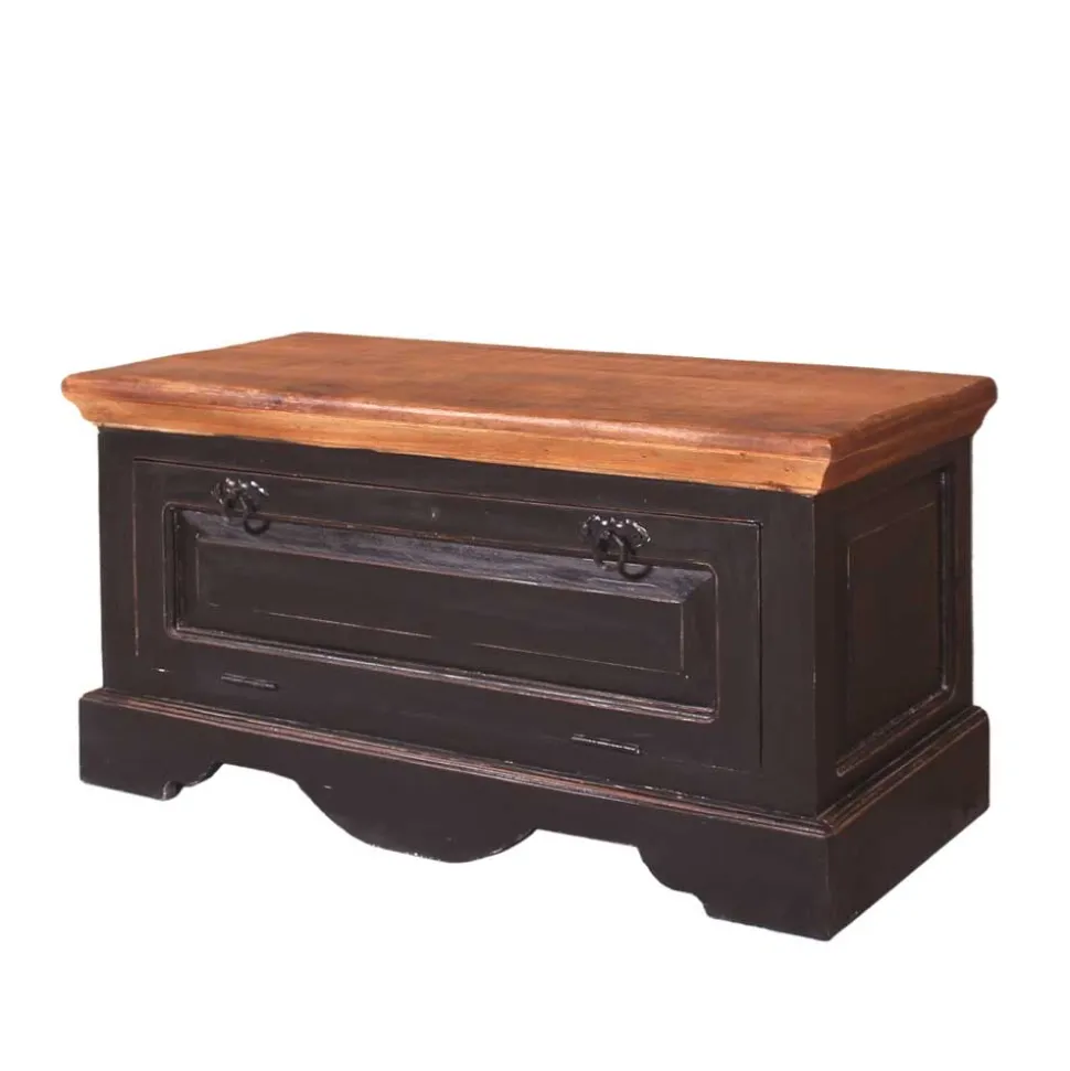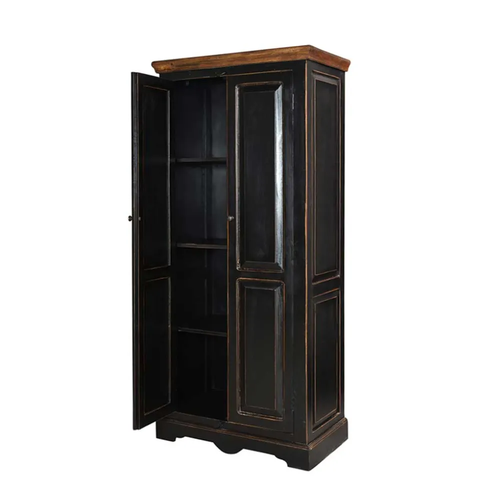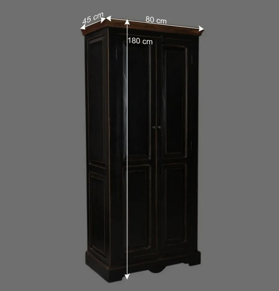 Die schwarzen, lackierten Oberflächen mit Antik-Finish bringen die honigfarben lackierten Deckplatten aus Massivholz hervor, ein optischer Akzent, der den besonderen Charme des Kolonialstils unterstreicht. Diese Garderobe ist mit beabsichtigten Gebrauchsspuren versehen, um Authentizität und Geschichte zu vermitteln.