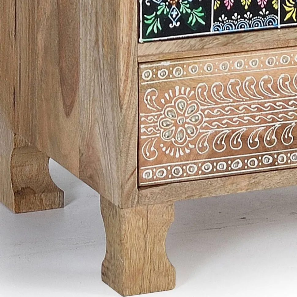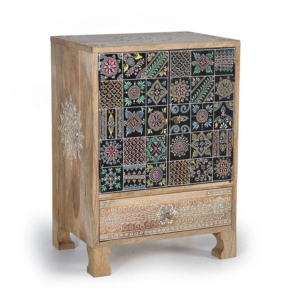 Dank seiner Herstellung aus hochwertigem Mangoholz bringt der Nachtschrank „Fenezian“ die natürliche Schönheit dieses Materials perfekt zur Geltung. Mangoholz ist bekannt für seine Stabilität und seine ausdrucksstarke Maserung, die durch die handgefertigten Verzierungen kunstvoll ergänzt wird. Jede Kommode ist ein Unikat – keine Maserung gleicht der anderen, und auch die handbemalten Ornamente sorgen für eine individuelle Gestaltung. Die Deckplatte, Seitenflächen und die Schubladenfront sind mit weißen Ornamenten und Mustern verziert, während die dunkel gehaltenen Türfronten durch feine weiße Linien optisch unterteilt werden. Jedes der dabei entstehenden Rechtecke wird von einem einzigartigen, farbenfrohen Muster geschmückt, das den handwerklichen Charakter des Möbelstücks betont.