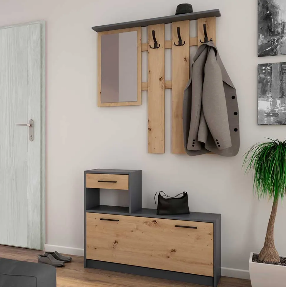 Willkommen in Ihrem neuen Eingangsbereich – gestaltet mit dem zeitgemäßen Flurmöbel Set „Tower“. Dieses zweifarbige Ensemble aus Wildeiche und Anthrazit verbindet nicht nur Funktionalität, sondern setzt auch stilvolle Akzente in Ihrem Zuhause.