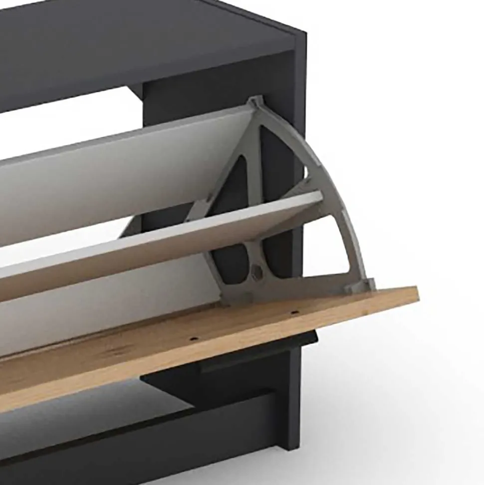Die Schuhkommode ist nicht nur ästhetisch, sondern auch äußerst funktional. Mit Maßen von BxHxT: 97x75x25 cm bietet sie Platz für Ihre Schuhe und Accessoires. Die Schuhklappe mit doppelter Walze innen, ein offenes Fach, eine Schublade, sowie schmale und breite Ablagen schaffen geordneten Stauraum.