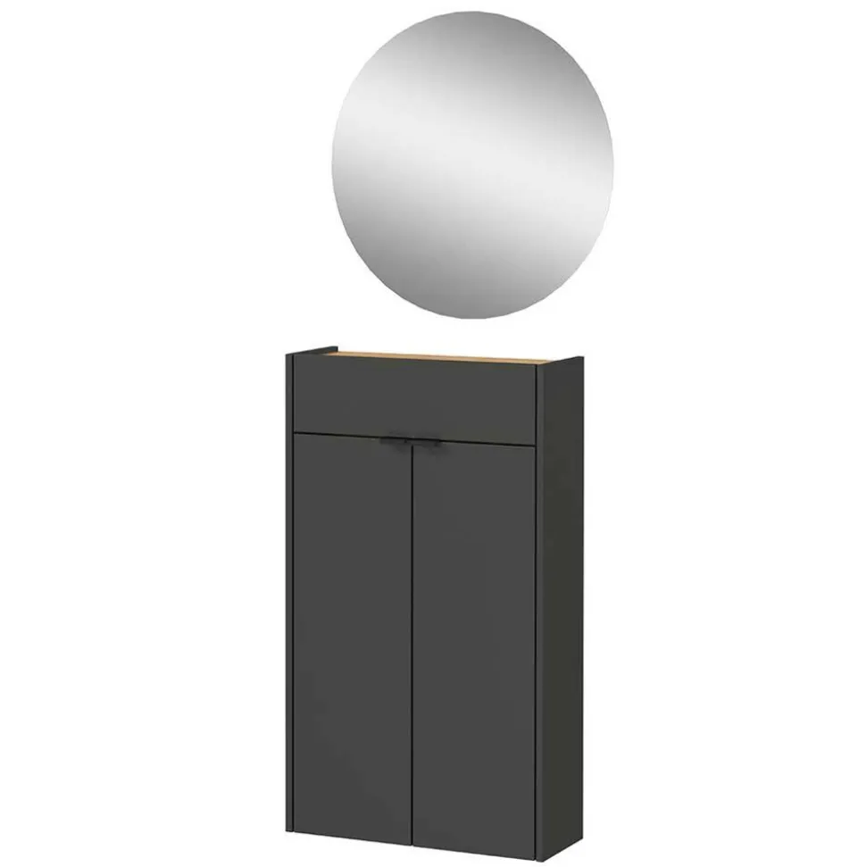 Ob schmaler Flur oder großzügiger Eingangsbereich – dieses zweiteilige Garderobenset überzeugt mit einem durchdachten Design, das wenig Platz einnimmt und gleichzeitig viel Stauraum bietet. Der Mehrzweckschrank und der runde Spiegel schaffen ein harmonisches Gesamtbild und bieten praktischen Nutzen für den Alltag.